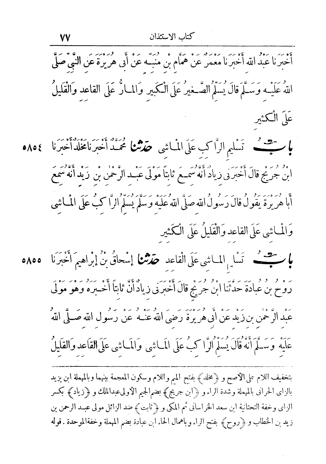 5854 - حَدَّثَنِي مُحَمَّدُ بْنُ سَلَامٍ أَخْبَرَنَا مَخْلَدٌ أَخْبَرَنَا ابْنُ جُرَيْجٍ قَالَ أَخْبَرَنِي زِيَادٌ أَنَّهُ سَمِعَ ثَابِتًا مَوْلَى عَبْدِ الرَّحْمَنِ بْنِ زَيْدٍ أَنَّهُ سَمِعَ أَبَا هُرَيْرَةَ يَقُولُ قَالَ رَسُولُ اللَّهِ صَلَّى اللَّهُ عَلَيْهِ وَسَلَّمَ يُسَلِّمُ الرَّاكِبُ عَلَى الْمَاشِي وَالْمَاشِي عَلَى الْقَاعِدِ وَالْقَلِيلُ عَلَى الْكَثِيرِ