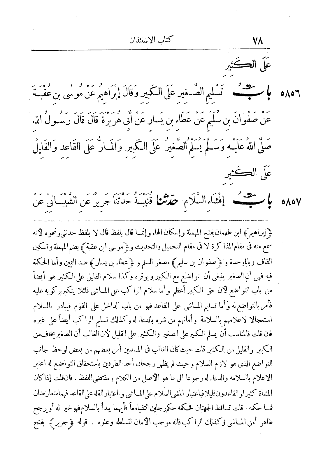 (إبراهيم) ابن طهمان بفتح المهملة وإسكان الهاء وإنما قال بلفظ قال لا بلفظ حدثني ونحوه لأنه سمع منه في مقام المذاكرة لا في مقام التحميل والتحديث و (موسى ابن عقبة) بضم المهملة وتسكين القاف وبالموحدة و (صفوان بن سليم) مصغر السلم و (عطاء بن يسار) ضد اليمين وأما الحكمة فيه فهي أن الصغير ينبغي أن يتواضع مع الكبير ويوقره وكذا سلام القليل على الكثير هو أيضًا من باب التواضع لأن حق الكبير أعظم وأما سلام الراكب على الماشي فلئلا يتكبر بركوبه عليه فأمر بالتواضع له وأما تسليم الماشي على القاعد فهو من باب الداخل على القوم فيبادر بالسلام استعجالا لإعلامهم بالسلامة وأمانهم من شره بالدعاء له وكذلك تسليم الراكب أيضًا على غيره فإن قلت فالمناسب أن يسلم الكبير على الصغير والكثير على القليل لأن الغالب أن الصغير يخاف من الكبير والقليل من الكثير قلت حيث كان الغالب في المسلمين أمن بعضهم من بعض لوحظ جانب التواضع الذي هو لازم السلام وحيث لم يظهر رجحان أحد الطرفين باستحقاق التواضع له اعتبر الإعلام بالسلامة والدعاء له رجوعا إلى ما هو الأصل من الكلام ومقتضى اللفظ، فإن قلت إذا كان المشاة كثيرا والقاعدون قليلا فباعتبار المشي السلام على الماشي وباعتبار القلة على القاعد فهما متعارضان فما حكمه، قلت تساقط الجهتان فحكمه حكم رجلين التقيا معًا فأيهما يبدأ بالسلام فهو خير له أو يرجح ظاهر أمن الماشي وكذلك الراكب فإنه موجب الأمان لتسلطه وعلوه، قوله (جرير) بفتح
