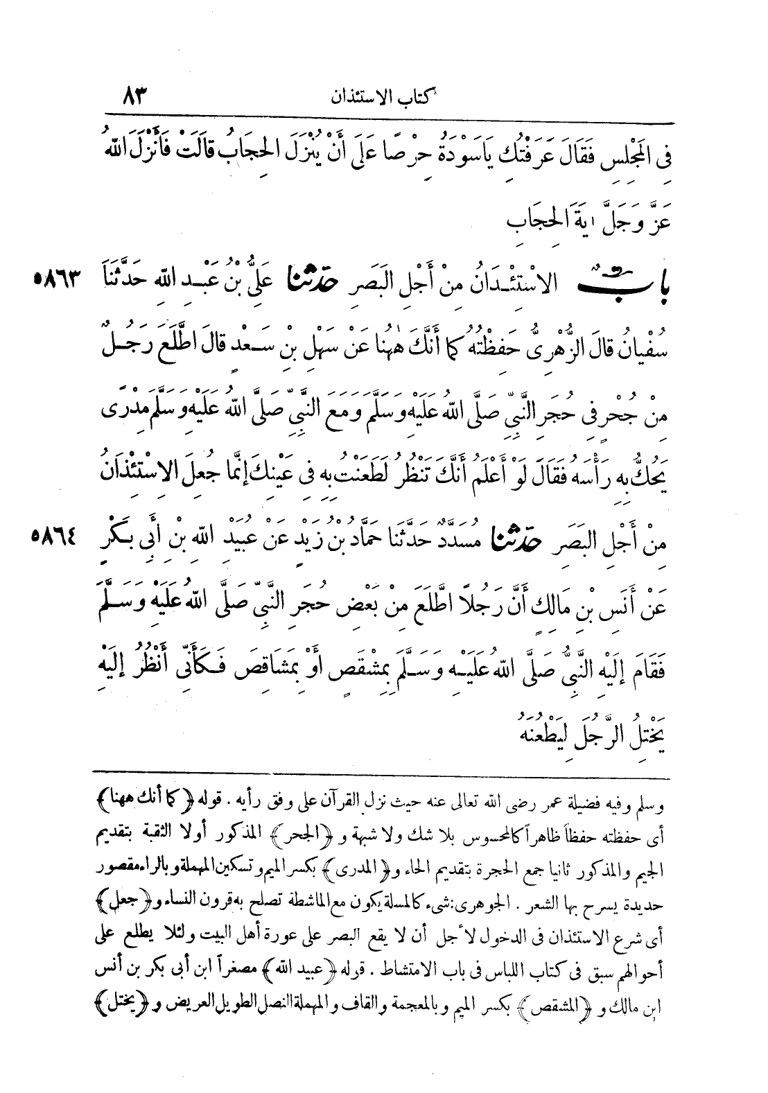 5863 - حَدَّثَنَا عَلِيُّ بْنُ عَبْدِ اللَّهِ حَدَّثَنَا سُفْيَانُ قَالَ الزُّهْرِيُّ حَفِظْتُهُ كَمَا أَنَّكَ هَا هُنَا عَنْ سَهْلِ بْنِ سَعْدٍ قَالَ اطَّلَعَ رَجُلٌ مِنْ جُحْرٍ فِي حُجَرِ النَّبِيِّ صَلَّى اللَّهُ عَلَيْهِ وَسَلَّمَ وَمَعَ النَّبِيِّ صَلَّى اللَّهُ عَلَيْهِ وَسَلَّمَ مِدْرًى يَحُكُّ بِهِ رَاسَهُ فَقَالَ لَوْ أَعْلَمُ أَنَّكَ تَنْظُرُ لَطَعَنْتُ بِهِ فِي عَيْنِكَ إِنَّمَا جُعِلَ الِاسْتِئْذَانُ مِنْ أَجْلِ الْبَصَرِ