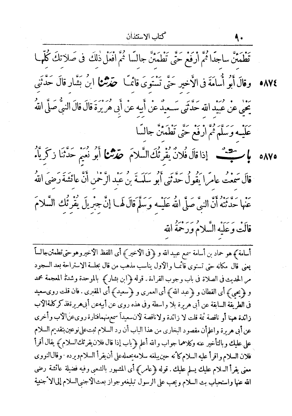 أسامة) حماد بن أسامة سمع عبيد الله و (في الأخير) أي اللفظ الأخير وهو حتى تطمئن جالسًا يعني قال مكانه حتى تستوي قائما والأول يناسب مذهب من قال بجلسة الاستراحة بعد السجود مر الحديث في الصلاة في باب وجوب القراءة، قوله (ابن بشار) بالموحدة وشدة المعجمة محمد و (يحي) أي القطان و (عبد الله) أي العمري و (سعيد) أي المقبري، فإن قلت روى سعيد في الطريقة السابقة عن أبي هريرة بلا واسطة وفي هذه روى عن أبيه عن أبي هريرة فذكر كلمة الأب زائدة هاهنا أو ناقصة ثمة قلت لا زائدة ولا ناقصة لأن سعيدًا سمع منهما فتارة روى عن الأب وأخرى عن أبي هريرة وأعلم أن مقصود البخاري من هذا الباب أن رد السلام ثبت على نوعين بتقديم السلام على عليك وبالتأخير عنه وكلاهما جواب والله أعلم (باب إذا قال فلان يقرئك السلام) يقال أقرأ فلان السلام واقرأ عليه السلام كأنه حين يبلغه سلامه يحمله على أن يقرأ السلام ويرده، وقال النووي معنى يقرأ السلام عليك يسلم عليك، قوله (عامر) أي مشهور بالشعبي وفيه فضيلة عائشة رضي الله عنها واستحباب بث السلام ويجب على الرسول تبليغه وجواز بعث الأجنبي السلام إلى الأجنبية