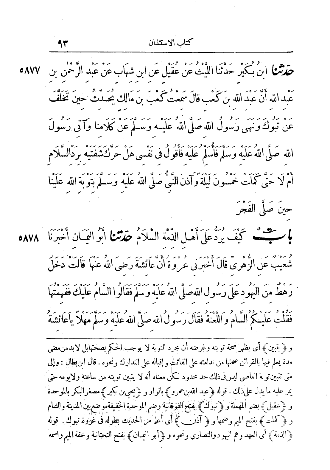 و (يتبين) أي يظهر صحة توبته وغرضه أن مجرد التوبة لا يوجب الحكم بصحتها بل لابد من مضي مدة يعلم فيها بالقرائن صحتها من ندامته على الفائت وإقباله على التدارك ونحوه، قال ابن بطال: وإلى متى تتبين توبة العاصي ليس في ذلك حد محدود لكن معناه أنه لا يتبين توبته من ساعته ولا يومه حتى يمر عليه ما يدل على ذلك، قوله (عبد الله بن عمرو) بالواو و (يحي بن بكير) مصغر البكر بالموحدة و (عقيل) بضم المهملة و (تبوك) بفتح الفوقانية وضم الموحدة الخفيفة موضع بين المدينة والشام و (كملت) بفتح الميم وضمها و (آذن) أي أعلم مر الحديث بطوله في غزوة تبوك، قوله (الذمة) أي العهد وهم اليهود والنصارى ونحوه و (أبو اليمان) بفتح التحتانية وخفة الميم واسمه