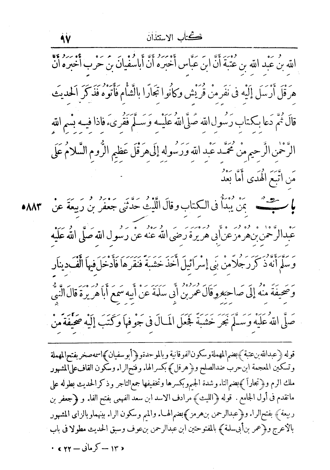 قوله (عبد الله بن عتبة) بضم المهملة وسكون الفوقانية وبالموحدة و (أبو سفيان) اسمه صخر بفتح المهملة وتسكين المعجمة ابن حرب ضد الصلح و (هرقل) بكسر الهاء وفتح الراء وسكون القاف على المشهور ملك الرم و (تجارًا) بضم التاء وشدة الجيم وبكسرها وتخفيفها جمع التاجر وذكر الحديث بطوله على ما تقدم في أول الجامع، قوله (الليث) مرادف الأسد ابن سعد الفهمي بفتح الفاء و (جعفر بن ربيعة) بفتح الراء و (عبد الرحمن بن هرمز) بضم الهاء والميم وسكون الراء بينهما وبالزاي المشهور بالأعرج و (عمر بن أبي سلمة) بالمفتوحتين ابن عبد الرحمن بن عوف وسبق الحديث مطولا في باب