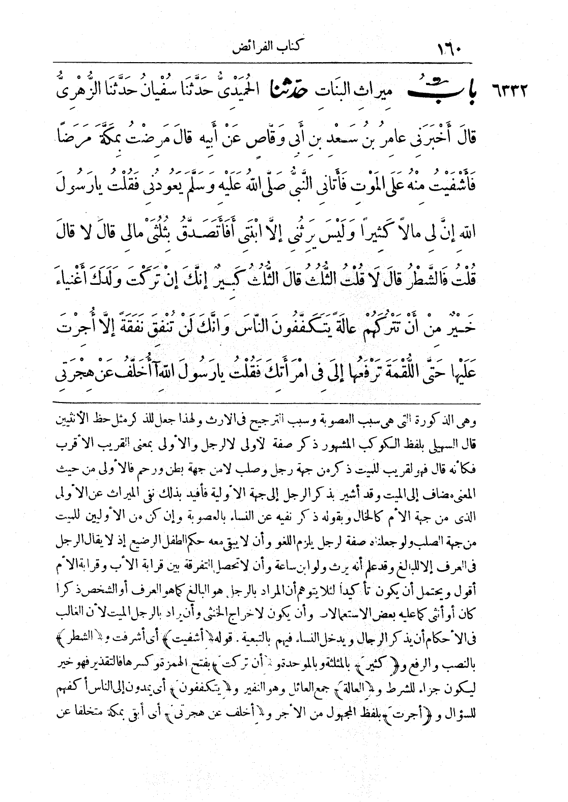 6332 - حَدَّثَنَا الْحُمَيْدِيُّ حَدَّثَنَا سُفْيَانُ حَدَّثَنَا الزُّهْرِيُّ قَالَ أَخْبَرَنِي عَامِرُ بْنُ سَعْدِ بْنِ أَبِي وَقَّاصٍ عَنْ أَبِيهِ قَالَ مَرِضْتُ بِمَكَّةَ مَرَضًا فَأَشْفَيْتُ مِنْهُ عَلَى الْمَوْتِ فَأَتَانِي النَّبِيُّ صَلَّى اللَّهُ عَلَيْهِ وَسَلَّمَ يَعُودُنِي فَقُلْتُ يَا رَسُولَ اللَّهِ إِنَّ لِي مَالًا كَثِيرًا وَلَيْسَ يَرِثُنِي إِلَّا ابْنَتِي أَفَأَتَصَدَّقُ بِثُلُثَيْ مَالِي قَالَ لَا قَالَ قُلْتُ فَالشَّطْرُ قَالَ لَا قُلْتُ الثُّلُثُ قَالَ الثُّلُثُ كَبِيرٌ إِنَّكَ إِنْ تَرَكْتَ وَلَدَكَ أَغْنِيَاءَ خَيْرٌ مِنْ أَنْ تَتْرُكَهُمْ عَالَةً يَتَكَفَّفُونَ النَّاسَ وَإِنَّكَ لَنْ تُنْفِقَ نَفَقَةً إِلَّا أُجِرْتَ عَلَيْهَا حَتَّى اللُّقْمَةَ تَرْفَعُهَا إِلَى فِي امْرَأَتِكَ فَقُلْتُ يَا رَسُولَ اللَّهِ آأُخَلَّفُ عَنْ هِجْرَتِي
