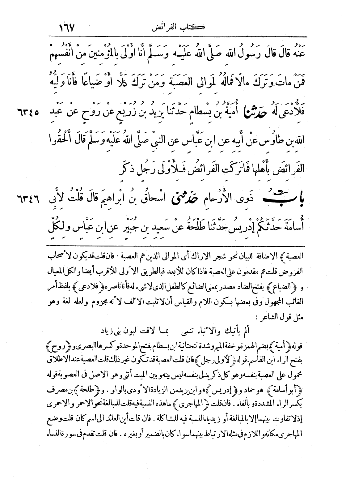 قوله (أمية) بضم الهمزة وخفة الميم وشدة التحتانية ابن بسطام بفتح الموحدة وكسرها البصري و (روح) بفتح الراء ابن القاسم. قوله (لأولى رجل) فإن قلت العصبة قد تكون غير ذلك قلت العصبة عند الإطلاق محمول على العصبة بنفسه وهو كل ذكر يدلي بنفسه ليس بينه وبين الميت أنثى وهو الأصل في العصوبة قوله (أبو أسامة) هو حماد و (إدريس) هو ابن يزيد من الزيادة الأودي بالواو. و (طلحة) بن مصرف بكسر الراء المشددة وبالفاء. فإن قلت (المهاجري) ما هذه النسبة فيه قلت للمبالغة نحو الأحمر والأحمري إذ لا تفاوت بينهما إلا بالمبالغة أو زيد ياء النسبة فيه للمشاكلة. فإن قلت أين العائد إلى اسم كان قلت وضع المهاجري مكانه واللازم في مثله الارتباط بينهما سواء كان بالضمير أو بغيره. فإن قلت تقدم في سورة النساء