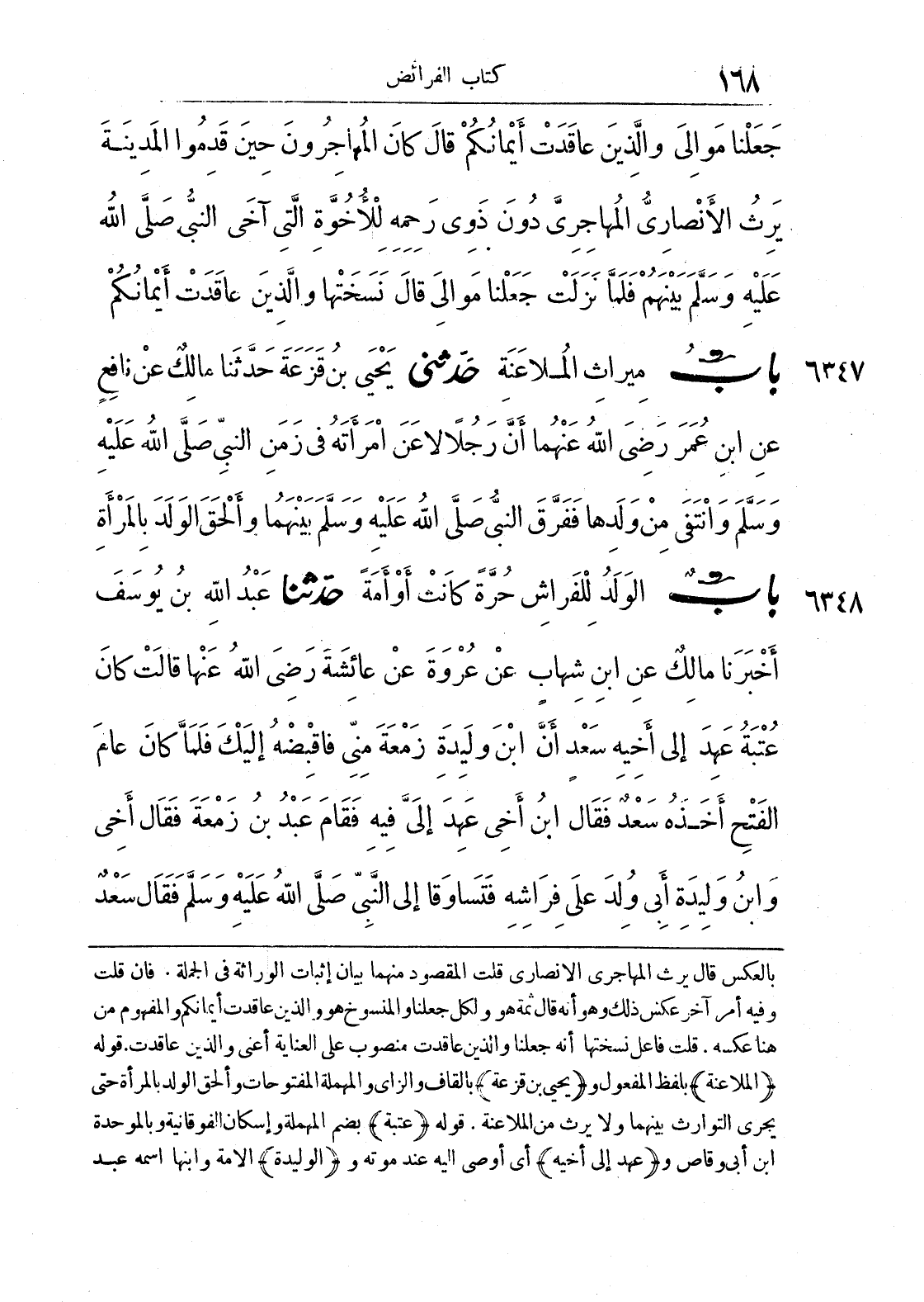 بالعكس قال يرث المهاجري الأنصاري قلت المقصود منهما بيان إثبات الوراثة في الجملة، فإن قلت وفيه أمر آخر عكس ذلك وهو أنه قال ثمة هو ولكل جعلنا والمنسوخ هو والذين عاقدت أيمانكم والمفهوم من هنا عكسه. قلت فاعل نسختها أنه جعلنا والذين عاقدت منصوب على العناية أعني والذين عاقدت، قوله (الملاعنة) بلفظ المفعول و (يحيى بن قزعة) بالقاف والزاي والمهملة المفتوحات وألحق الولد بالمرأة حتى يجري التوارث بينهما ولا يرث من الملاعنة، قوله (عتبة) بضم المهملة وإسكان الفوقانية وبالموحدة ابن أبي وقاص و (عهد إلى أخيه) أي أوصى إليه عند موته و (الوليدة) الأمة وابنها اسمه عبد