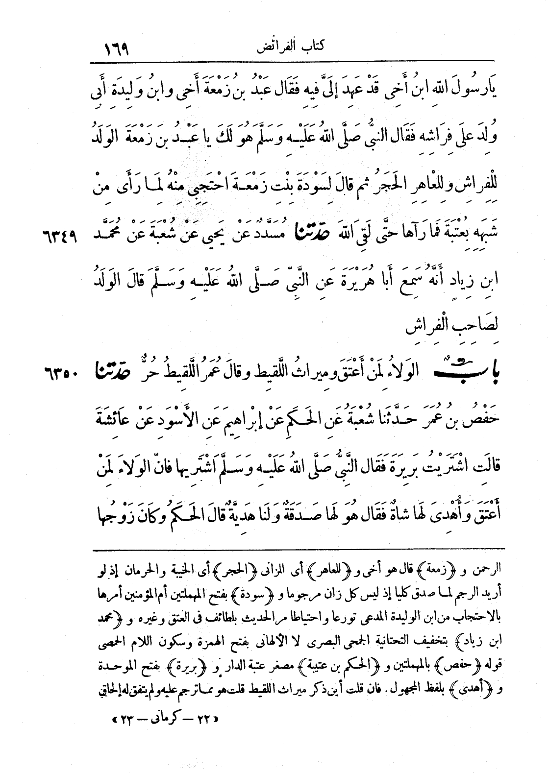 الرحمن و (زمعة) قال هو أخي و (للعاهر) أي المزاني (الحجر) أي الخيبة والحرمان إذ لو أريد بالرجم لما صدق كليا إذ ليس كل زان مرجوما و (سودة) بفتح المهملتين أم المؤمنين أمرها بالاحتجاب من ابن الوليدة المدعى تورعا واحتياطا مر الحديث بلطائف في العتق وغيره و (محمد ابن زياد) بتخفيف التحتانية الجمحي البصري لا الألهاني بفتح الهمزة وسكون اللام الحمصي قوله (حفص) بالمهملتين و (الحكم بن عتيبة) مصغر عتبة الدار و (بربرة) بفتح الموحدة و (أهدى) بلفظ المجهول، فإن قلت أين ذكر ميراث اللقيط قلت هو مما ترجم عليه ولم يتفق له إلحاق