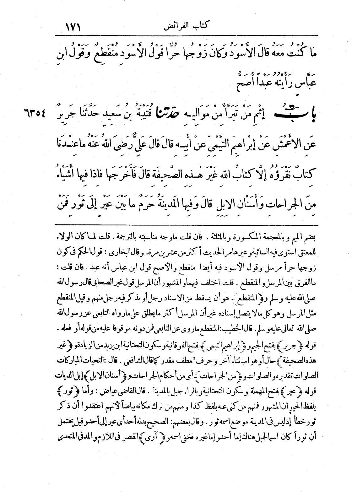 6354 - حَدَّثَنَا قُتَيْبَةُ بْنُ سَعِيدٍ حَدَّثَنَا جَرِيرٌ عَنْ الْأَعْمَشِ عَنْ إِبْرَاهِيمَ التَّيْمِيِّ عَنْ أَبِيهِ قَالَ قَالَ عَلِيٌّ رَضِيَ اللَّهُ عَنْهُ مَا عِنْدَنَا كِتَابٌ نَقْرَؤُهُ إِلَّا كِتَابُ اللَّهِ غَيْرَ هَذِهِ الصَّحِيفَةِ قَالَ فَأَخْرَجَهَا فَإِذَا فِيهَا أَشْيَاءُ مِنْ الْجِرَاحَاتِ وَأَسْنَانِ الْإِبِلِ قَالَ وَفِيهَا الْمَدِينَةُ حَرَمٌ مَا بَيْنَ عَيْرٍ إِلَى ثَوْرٍ فَمَنْ