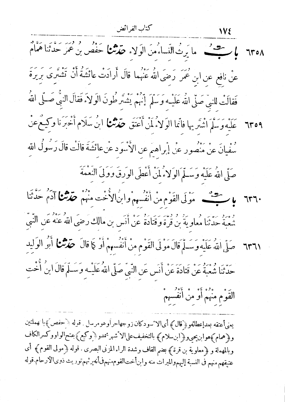 6361 - حَدَّثَنَا أَبُو الْوَلِيدِ حَدَّثَنَا شُعْبَةُ عَنْ قَتَادَةَ عَنْ أَنَسٍ عَنْ النَّبِيِّ صَلَّى اللَّهُ عَلَيْهِ وَسَلَّمَ قَالَ ابْنُ أُخْتِ الْقَوْمِ مِنْهُمْ أَوْ مِنْ أَنْفُسِهِمْ