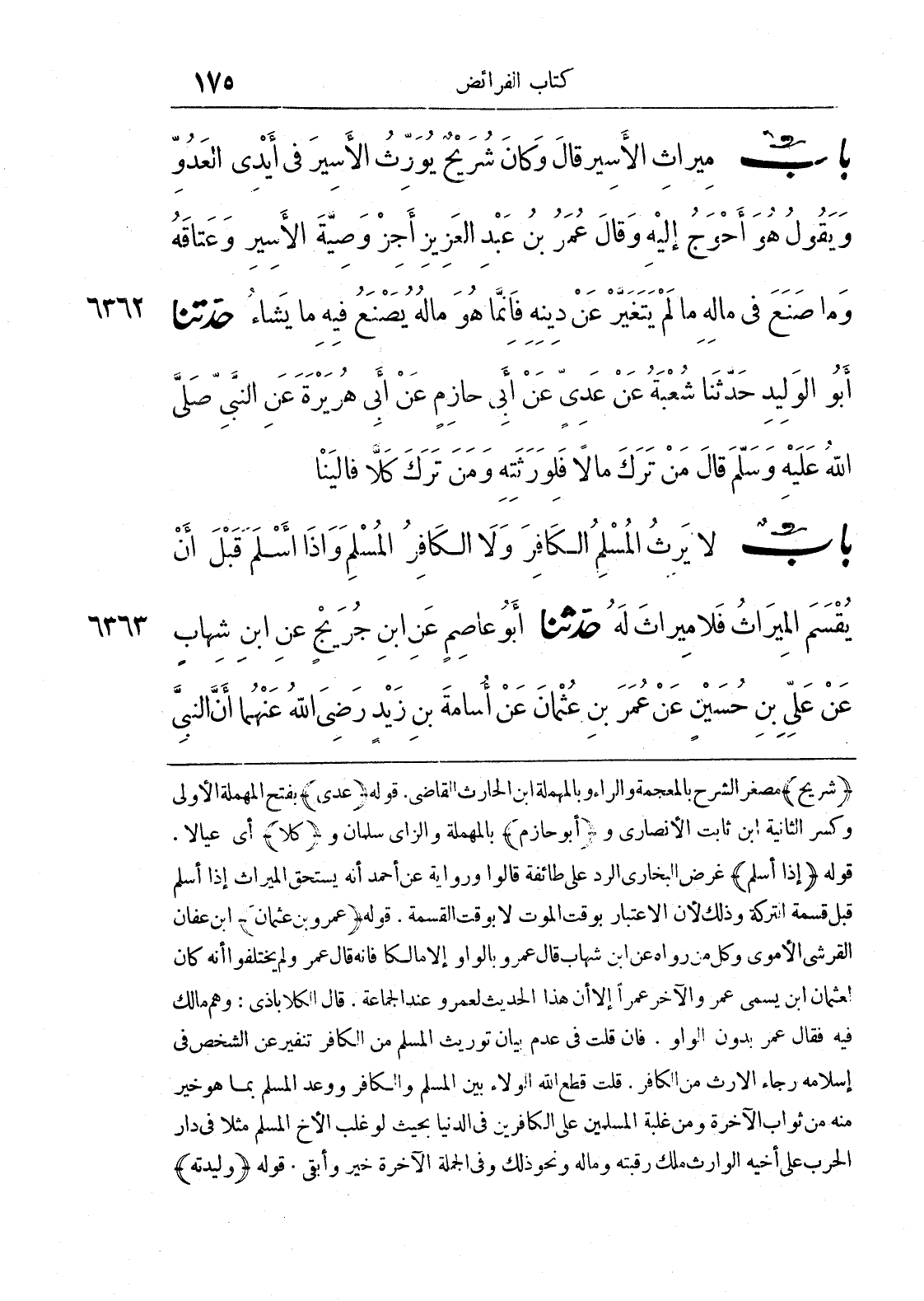 (شريح) مصغر الشرح بالمعجمة والراء وبالمهملة ابن الحارث القاضي. قوله رعدي) بفتح المهملة الأولى وكسر الثانية ابن ثابت الأنصاري و (أبو حازم) بالمهملة والزاي سلمان و (كلا) أي عيالا، قوله (إذا أسلم) غرض البخاري الرد على طائفة قالوا ورواية عن أحمد أنه يستحق الميراث إذا أسلم قبل قسمة التركة وذلك لأن الاعتبار بوقت الموت لا بوقت القسمة، قوله (عمرو بن عثمان) ابن عفان القرشي الأموي وكل من رواه عن ابن شهاب قال عمرو بالواو إلا مالكا فإنه قال عمر ولم يتخلفوا أنه كان لعثمان ابن يسمى عمر والآخر عمرًا إلا أن هذا الحديث لعمرو عند الجماعة. قال الكلاباذي: وهم مالك فيه فقال عمر بدون الواو، فإن قلت في عدم بيان توريث المسلم من الكافر تنفير عن الشخص في إسلامه رجاء الإرث من الكافر. قلت قطع الله الولاء بين المسلم والكافر ووعد المسلم بما هو خير منه من ثواب الآخرة ومن غلبة المسلمين على الكافرين في الدنيا بحيث لو غلب الأخ المسلم مثلا في دار الحرب على أخيه الوارث ملك رقبته وماله ونحو ذلك وفي الجملة الآخرة خير وأبقى، قوله (وليدته)