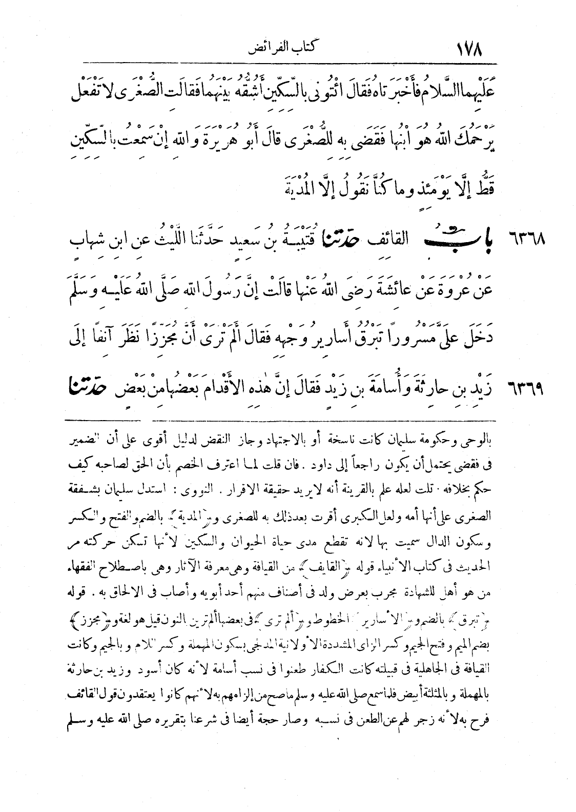 6368 - حَدَّثَنَا قُتَيْبَةُ بْنُ سَعِيدٍ حَدَّثَنَا اللَّيْثُ عَنْ ابْنِ شِهَابٍ عَنْ عُرْوَةَ عَنْ عَائِشَةَ رَضِيَ اللَّهُ عَنْهَا قَالَتْ إِنَّ رَسُولَ اللَّهِ صَلَّى اللَّهُ عَلَيْهِ وَسَلَّمَ دَخَلَ عَلَيَّ مَسْرُورًا تَبْرُقُ أَسَارِيرُ وَجْهِهِ فَقَالَ أَلَمْ تَرَيْ أَنَّ مُجَزِّزًا نَظَرَ آنِفًا إِلَى زَيْدِ بْنِ حَارِثَةَ وَأُسَامَةَ بْنِ زَيْدٍ فَقَالَ إِنَّ هَذِهِ الْأَقْدَامَ بَعْضُهَا مِنْ بَعْضٍ