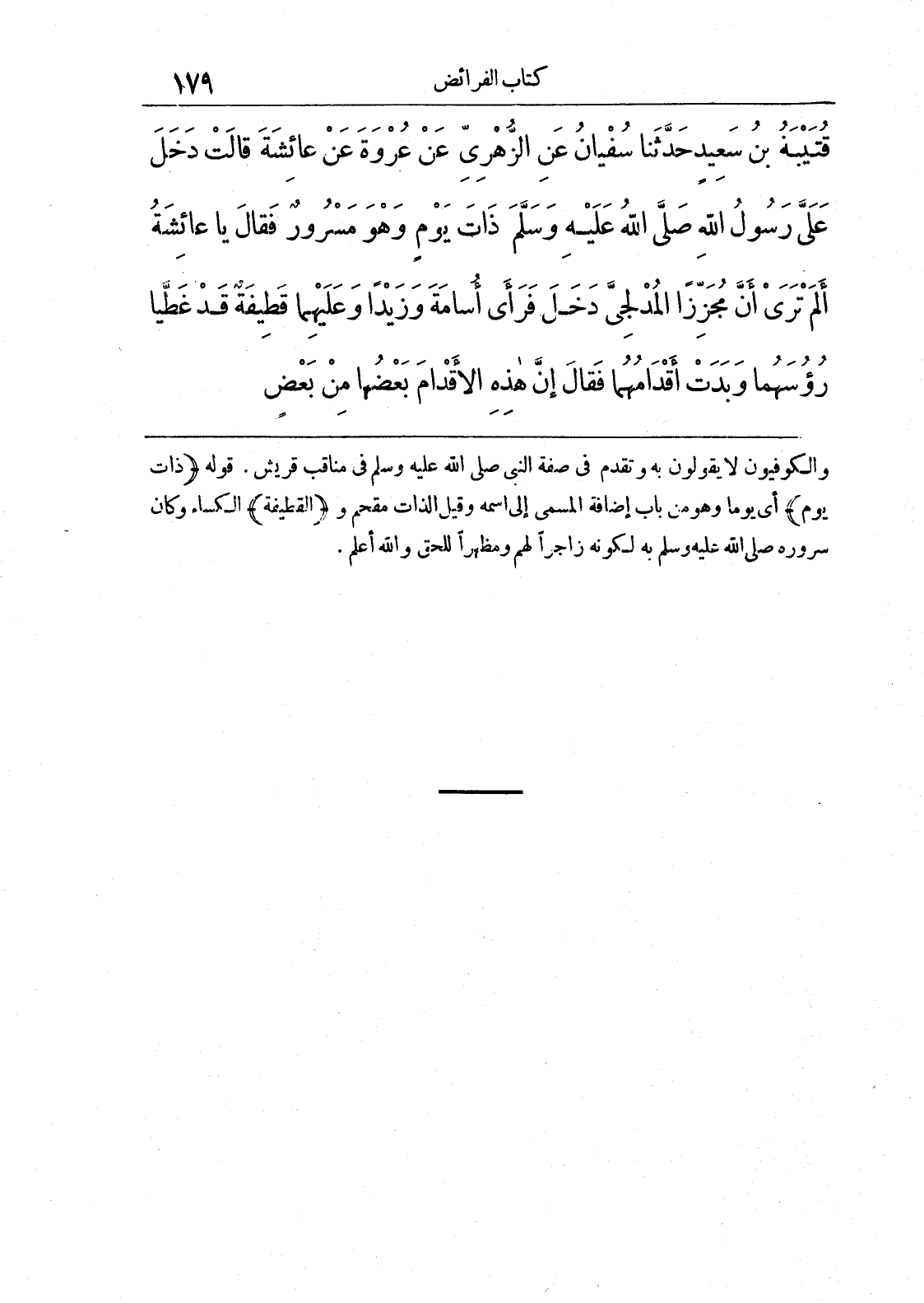 قُتَيْبَةُ بْنُ سَعِيدٍ حَدَّثَنَا سُفْيَانُ عَنْ الزُّهْرِيِّ عَنْ عُرْوَةَ عَنْ عَائِشَةَ قَالَتْ دَخَلَ عَلَيَّ رَسُولُ اللَّهِ صَلَّى اللَّهُ عَلَيْهِ وَسَلَّمَ ذَاتَ يَوْمٍ وَهُوَ مَسْرُورٌ فَقَالَ يَا عَائِشَةُ أَلَمْ تَرَيْ أَنَّ مُجَزِّزًا الْمُدْلِجِيَّ دَخَلَ عَلَيَّ فَرَأَى أُسَامَةَ بْنَ زَيْدٍ وَزَيْدًا وَعَلَيْهِمَا قَطِيفَةٌ قَدْ غَطَّيَا رُءُوسَهُمَا وَبَدَتْ أَقْدَامُهُمَا فَقَالَ إِنَّ هَذِهِ الْأَقْدَامَ بَعْضُهَا مِنْ بَعْضٍ