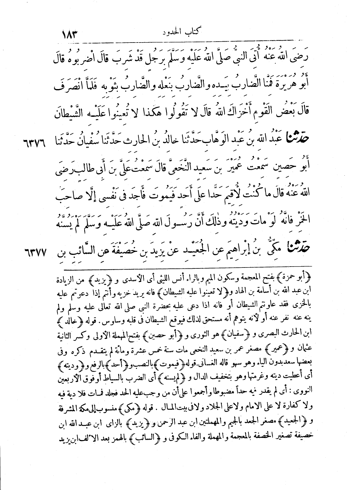 (أبو حمزة) بفتح المعجمة وسكون الميم وبالراء أنس الليثي أي الأسدي و (يزيد) من الزيادة ابن عبد الله بن أسامة بن الهاد و (لا تعينوا عليه الشيطان) فإنه يريد خزيه وأنتم إذا دعوتم عليه بالخزي فقد عاونتم الشيطان أو فإنه إذا دعى عليه بحضرة النبي صلى الله تعالى عليه وسلم ولم ينه عنه نفر عنه أو لأنه يتوهم أنه مستحق لذلك فيوقع الشيطان في قلبه وساوس. قوله (خالد) ابن الحارث البصري و (سفيان) هو الثوري و (أبو حصين) بفتح المهملة الأولى وكسر الثانية عثمان و (عمير) مصغر عمر بن سعيد النخعي مات سنة خمس عشرة ومائة لم يتقدم ذكره وفي بعضها سعد بدون الياء وهو سهو قاله الغساني. قوله (فيموت) بالنصب و (أحد) بالرفع و (وديته) أي أعطيت ديته وغرمتها وهو بتخفيف الدال و (لم يسنه) أي الضرب بالسياط أو فوق الأربعين النووي: أي لم يقدر فيه حدا مضبوطا وأجمعوا على أن من وجب عليه الحد فجلد فمات فلا دية فيه ولا كفارة لا على الإمام ولا على الجلاد ولا في بيت المال. قوله (مكي) منسوب إلى مكة المشرفة و (الجعد) مصغر الجعد بالجيم والمهملتين ابن عبد الرحمن و (يزيد) بالزاي ابن عبد الله ابن خصيفة تصغير الخصفة بالمعجمة والمهملة والفاء الكوفي و (السائب) بالهمز بعد الألف ابن يزيد