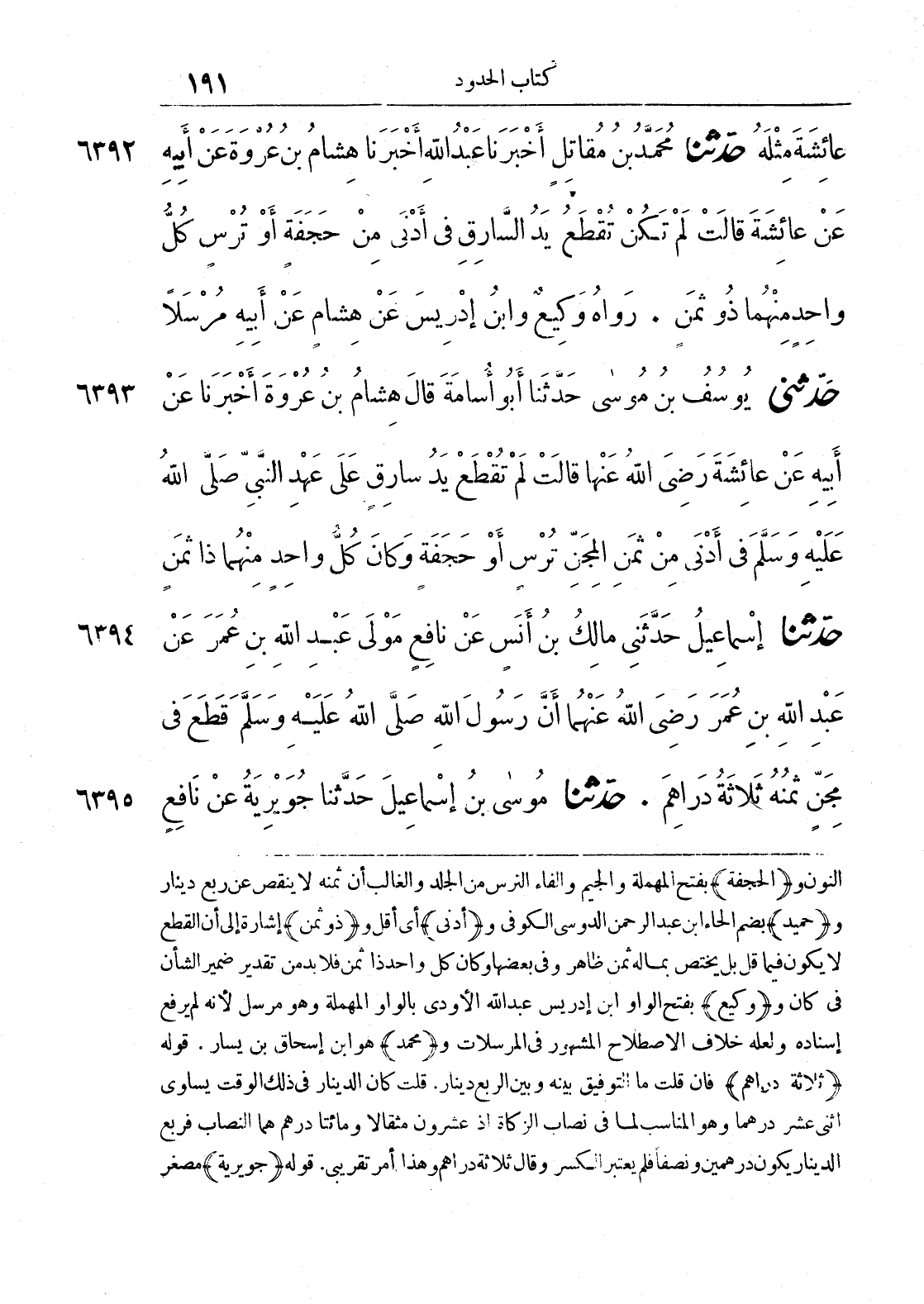 النون و (الجحفة) بفتح المهملة والجيم والفاء الترس من الجلد والغالب أن ثمنه لا ينقص عن ربع دينار و (حميد) بضم الحاء ابن عبد الرحمن الدوسي الكوفي و (أدنى) أي أقل و (ذو ثمن) إشارة إلى أن القطع لا يكون فيما قل بل يختص بما له ثمن ظاهر وفي بعضها وكان كل واحد ذا ثمن فلا بد من تقدير ضمير الشأن في كان و (وكيع) بفتح الواو ابن إدريس عبد الله الأودي بالواو والمهملة وهو مرسل لأنه لم يرفع إسناده ولعله خلاف الاصطلاح المشهور في المرسلات و (محمد) هو ابن إسحاق بن يسار، قوله (ثلاثة دراهم) فإن قلت ما التوفيق بينه وبين الربع دينار، قلت كان الدينار في ذلك الوقت يساوي اثني عشر درهما وهو المناسب لما في نصاب الزكاة إذ عشرون مثقالا ومائتا درهم هما النصاب فربع الدينار يكون درهمين ونصفا فلم يعتبر الكسر وقال ثلاثة دراهم وهذا أمر تقريبي. قوله (جويرية) مصغر