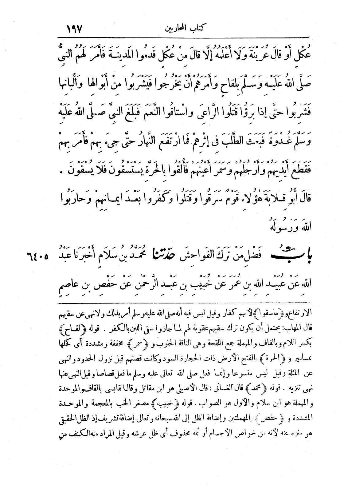 الارتفاع و (ما سقوا) لأنهم كفار وقيل ليس فيه أنه صلى الله عليه وسلم أمر بذلك ولا نهى عن سقيهم قال المهلب: يحتمل أن يكون ترك سقيهم عقوبة لهم جازوا سقى اللبن بالكفر، قوله (لقاح) بكسر اللام وبالقاف والمهملة جمع اللقحة وهي الناقة الحلوب و (سمر) مخففة ومشددة أي كحلها بمسامير و (الحرة) بالفتح الأرض ذات الحجارة السود وكانت قصتهم قبل نزول الحدود والنهي عن المثلثة وقيل ليس منسوخا وإنما فعل صلى الله تعالى عليه وسلم ما فعل قصاصا وقيل النهي عنها نهي تنزيه. قوله (محمد) قال الغساني: قال الأصيلي هو ابن مقاتل وقال القابسي بالقاف والموحدة والمهملة هو ابن سلام والأول هو الصواب. قوله (خبيب) مصغر الخب بالمعجمة والموحدة المشددة و (حفص) بالمهملتين وإضافة الظل إلى الله سبحانه وتعالى إضافة تشريف إذ الظل الحقيقي هو منزه عنه لأنه من خواص الأجسام أو ثمة محذوف أي ظل عرشه وقيل المراد منه الكنف من