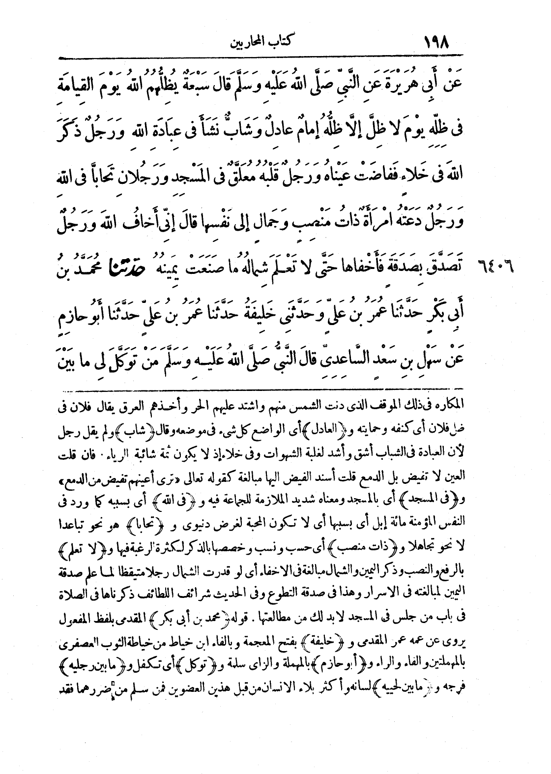 المكاره في ذلك الموقف الذي دنت الشمس منهم واشتد عليهم الحر وأخذهم العرق يقال فلان في ظل فلان أي كنفه وحمايته و (العادل) أي الواضع كل شيء في موضعه وقال (شاب) ولم يقل رجل لأن العبادة في الشباب أشق وأشد لغلبة الشهوات وفي خلاء إذ لا يكون ثمة شائبة الرياء. فإن قلت العين لا تفيض بل الدمع قلت أسند الفيض إليها مبالغة كقوله تعالى «ترى أعينهم تفيض من الدمع» و (في المسجد) أي بالمسجد ومعناه شديد الملازمة للجماعة فيه و (في الله) أي بسببه كما ورد في النفس المؤمنة مائة إبل أي بسببها أي لا تكون المحبة لغرض دنيوي و (تحابا) هو نحو تباعدا لا نحو تجاهلا و (ذات منصب) أي حسب ونسب وخصصها بالذكر لكثرة الرغبة فيها و (لا تعلم) بالرفع والنصب وذكر اليمين والشمال مبالغة في الإخفاء أي لو قدرت الشمال رجلا متيقظا لما علم صدقة اليمين لمبالغته في الأسرار وهذا في صدقة التطوع وفي الحديث شرائف اللطائف ذكرناها في الصلاة في باب من جلس في المسجد لا بد لك من مطالعتها. قوله (محمد بن أبي بكر) المقدمي بلفظ المفعول يروي عن عمه عمر المقدمي و (خليفة) بفتح المعجمة وبالفاء ابن خياط من خياطة الثوب العصفري بالمهملتين والفاء والراء و (أبو حازم) بالمهملة والزاي سلمة و (توكل) أي تكفل و (ما بين رجليه) فرجة و (ما بين لحييه) لسانه وأكثر بلاء الإنسان من قبل هذين العضوين فمن سلم من ضررهما فقد