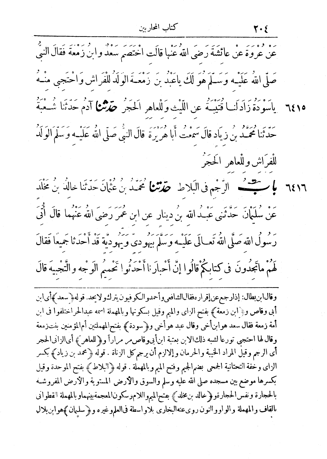 وقال ابن بطال: إذا رجع عن إقراره فقال الشافعي وأحمد والكوفيون يترك ولا يحد، قوله (سعد) أي ابن أبي وقاص و (ابن زمعة) بفتح الزاي والميم وقيل بسكونها وبالمهملة اسمه عبد الحر اختلفوا في ابن أمة زمعة فقال سعد هو ابن أخي وقال عبد هو أخي و (سودة) بفتح المهملتين أم المؤمنين بنت زمعة وقال لها احتجبي تورعا لشبه ذلك الابن بعتبة ابن أبي وقاص مر مرارا و (للعاهر) أي الزاني الحجر أي الرجم وقيل المراد الخيبة والحرمان وإلا لزم أن يرجم كل الزناة. قوله (محمد بن زياد) بكسر الزاي وخفة التحتانية الجمحي بضم الجيم وفتح الميم وبالمهملة. قوله (البلاط) بفتح الموحدة وقيل بكسرها موضع بين مسجده صلى الله عليه وسلم والسوق والأرض المستوية والأرض المفروشة بالحجارة ونفس الحجارة و (خالد بن مخلد) بفتح الميم واللام وسكون المعجمة بينهما وبالمهملة القطواني بالقاف والمهلمة والواو والنون روى عنه البخاري بلا واسطة في العلم وغيره و (سليمان) هو ابن بلال