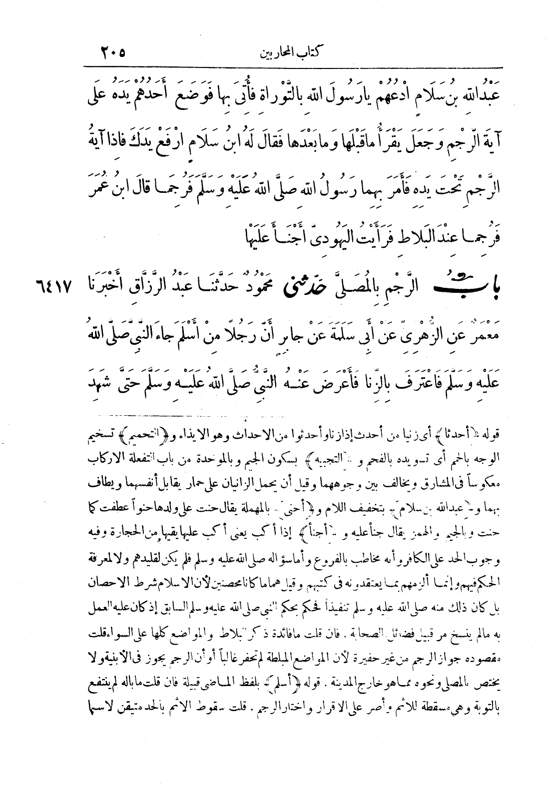 قوله (أحدثا) أي زنيا من أحدث إذا زنا وأحدثوا من الاحداث وهو الإيذاء و (التحميم) تسخيم الوجه بالحمم أي تسويده بالفحم و (التجبيه) بسكون الجيم وبالموحدة من باب التفعلة الاركاب معكوسا في المشارق ويخالف بين وجوههما وقيل أن يحمل الزانيان على حمار يقال أنفسهما ويطاف بهما و (عبد الله بن سلام) بتخفيف اللام و (أحنى) بالمهملة يقال حنت على ولدها حنوًا عطفت كما حنت وبالجيم والهمز يقال جنأ عليه و (أجنأ) إذا أكب يعني أكب عليها يقيها من الحجارة وفيه وجوب الحد على الكافر وأنه مخاطب بالفروع وأما سؤاله صلى الله عليه وسلم فلم يكن لقليدهم ولا لمعرفة الحكم فيهم وإنما ألزمهم بما يعتقدونه في كتبهم وقيل هما ما كانا محصنين لأن الإسلام شرط الاحصان بل كان ذلك منه صلى الله عليه وسلم تنفيذا فحكم بحكم النبي صلى الله عليه وسلم السابق إذ كان عليه العمل بما لم ينسخ مر قبيل فضائل الصحابة. فإن قلت ما فائدة ذكر البلاط والمواضع كلها على السواء قلت مقصوده جواز الرجم من غير حفيرة لأن المواضع المبلطة لم تحفر غالبا أو أن الرجم يجوز في الأبنية ولا يختص بالمصلى ونحوه مما هو خارج المدينة، قوله (أسلم) بلفظ الماضي قبيلة فإن قلت ما باله لم ينتفع بالتوبة وهي مسقطة للإثم وأصر على الإقرار واختار الرجم. قلت سقوط الإثم بالحد متيقن لا سيما
