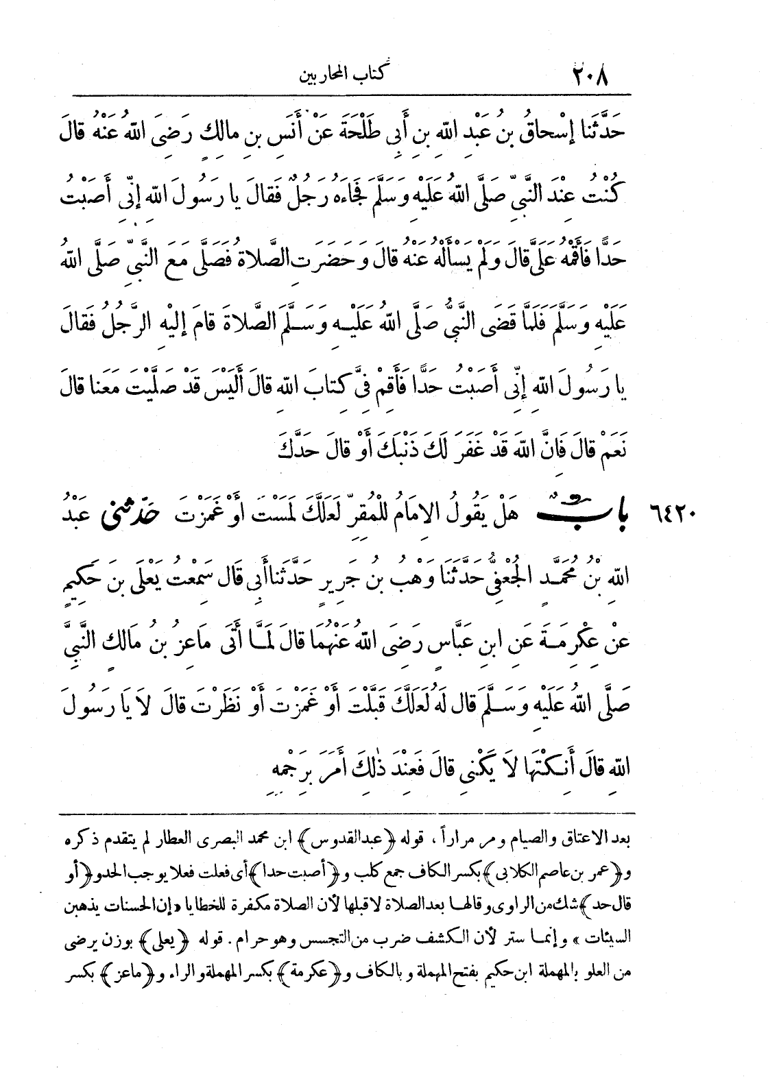 حَدَّثَنَا إِسْحَاقُ بْنُ عَبْدِ اللَّهِ بْنِ أَبِي طَلْحَةَ عَنْ أَنَسِ بْنِ مَالِكٍ رَضِيَ اللَّهُ عَنْهُ قَالَ كُنْتُ عِنْدَ النَّبِيِّ صَلَّى اللَّهُ عَلَيْهِ وَسَلَّمَ فَجَاءَهُ رَجُلٌ فَقَالَ يَا رَسُولَ اللَّهِ إِنِّي أَصَبْتُ حَدًّا فَأَقِمْهُ عَلَيَّ قَالَ وَلَمْ يَسْأَلْهُ عَنْهُ قَالَ وَحَضَرَتْ الصَّلَاةُ فَصَلَّى مَعَ النَّبِيِّ صَلَّى اللَّهُ عَلَيْهِ وَسَلَّمَ فَلَمَّا قَضَى النَّبِيُّ صَلَّى اللَّهُ عَلَيْهِ وَسَلَّمَ الصَّلَاةَ قَامَ إِلَيْهِ الرَّجُلُ فَقَالَ يَا رَسُولَ اللَّهِ إِنِّي أَصَبْتُ حَدًّا فَأَقِمْ فِيَّ كِتَابَ اللَّهِ قَالَ أَلَيْسَ قَدْ صَلَّيْتَ مَعَنَا قَالَ نَعَمْ قَالَ فَإِنَّ اللَّهَ قَدْ غَفَرَ لَكَ ذَنْبَكَ أَوْ قَالَ حَدَّكَ