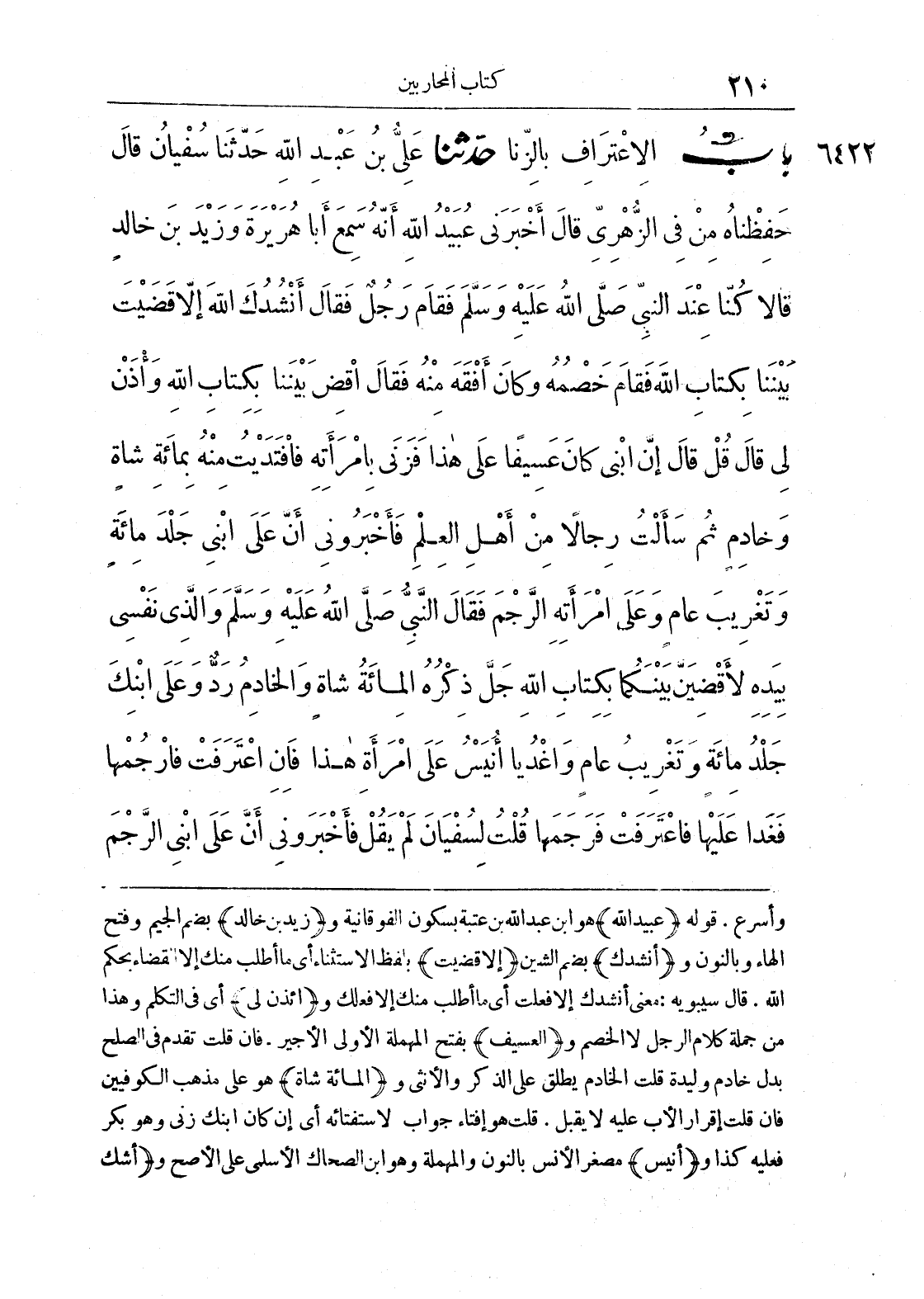 6422 - حَدَّثَنَا عَلِيُّ بْنُ عَبْدِ اللَّهِ حَدَّثَنَا سُفْيَانُ قَالَ حَفِظْنَاهُ مِنْ فِي الزُّهْرِيِّ قَالَ أَخْبَرَنِي عُبَيْدُ اللَّهِ أَنَّهُ سَمِعَ أَبَا هُرَيْرَةَ وَزَيْدَ بْنَ خَالِدٍ قَالَا كُنَّا عِنْدَ النَّبِيِّ صَلَّى اللَّهُ عَلَيْهِ وَسَلَّمَ فَقَامَ رَجُلٌ فَقَالَ أَنْشُدُكَ اللَّهَ إِلَّا قَضَيْتَ بَيْنَنَا بِكِتَابِ اللَّهِ فَقَامَ خَصْمُهُ وَكَانَ أَفْقَهَ مِنْهُ فَقَالَ اقْضِ بَيْنَنَا بِكِتَابِ اللَّهِ وَاذَنْ لِي قَالَ قُلْ قَالَ إِنَّ ابْنِي كَانَ عَسِيفًا عَلَى هَذَا فَزَنَى بِامْرَأَتِهِ فَافْتَدَيْتُ مِنْهُ بِمِائَةِ شَاةٍ وَخَادِمٍ ثُمَّ سَأَلْتُ رِجَالًا مِنْ أَهْلِ الْعِلْمِ فَأَخْبَرُونِي أَنَّ عَلَى ابْنِي جَلْدَ مِائَةٍ وَتَغْرِيبَ عَامٍ وَعَلَى امْرَأَتِهِ الرَّجْمَ فَقَالَ النَّبِيُّ صَلَّى اللَّهُ عَلَيْهِ وَسَلَّمَ وَالَّذِي نَفْسِي بِيَدِهِ لَأَقْضِيَنَّ بَيْنَكُمَا بِكِتَابِ اللَّهِ جَلَّ ذِكْرُهُ الْمِائَةُ شَاةٍ وَالْخَادِمُ رَدٌّ عَلَيْكَ وَعَلَى ابْنِكَ جَلْدُ مِائَةٍ وَتَغْرِيبُ عَامٍ وَاغْدُ يَا أُنَيْسُ عَلَى امْرَأَةِ هَذَا فَإِنْ اعْتَرَفَتْ فَارْجُمْهَا فَغَدَا عَلَيْهَا فَاعْتَرَفَتْ فَرَجَمَهَا قُلْتُ لِسُفْيَانَ لَمْ يَقُلْ فَأَخْبَرُونِي أَنَّ عَلَى ابْنِي الرَّجْمَ