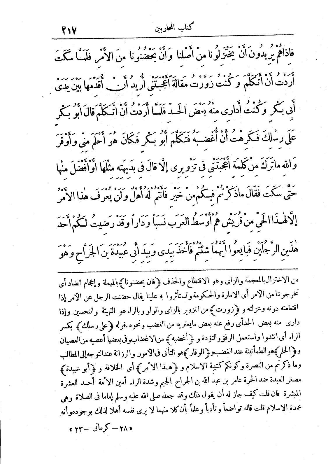 فَإِذَا هُمْ يُرِيدُونَ أَنْ يَخْتَزِلُونَا مِنْ أَصْلِنَا وَأَنْ يَحْضُنُونَا مِنْ الْأَمْرِ فَلَمَّا سَكَتَ أَرَدْتُ أَنْ أَتَكَلَّمَ وَكُنْتُ قَدْ زَوَّرْتُ مَقَالَةً أَعْجَبَتْنِي أُرِيدُ أَنْ أُقَدِّمَهَا بَيْنَ يَدَيْ أَبِي بَكْرٍ وَكُنْتُ أُدَارِي مِنْهُ بَعْضَ الْحَدِّ فَلَمَّا أَرَدْتُ أَنْ أَتَكَلَّمَ قَالَ أَبُو بَكْرٍ عَلَى رِسْلِكَ فَكَرِهْتُ أَنْ أُغْضِبَهُ فَتَكَلَّمَ أَبُو بَكْرٍ فَكَانَ هُوَ أَحْلَمَ مِنِّي وَأَوْقَرَ وَاللَّهِ مَا تَرَكَ مِنْ كَلِمَةٍ أَعْجَبَتْنِي فِي تَزْوِيرِي إِلَّا قَالَ فِي بَدِيهَتِهِ مِثْلَهَا أَوْ أَفْضَلَ مِنْهَا حَتَّى سَكَتَ فَقَالَ مَا ذَكَرْتُمْ فِيكُمْ مِنْ خَيْرٍ فَأَنْتُمْ لَهُ أَهْلٌ وَلَنْ يُعْرَفَ هَذَا الْأَمْرُ إِلَّا لِهَذَا الْحَيِّ مِنْ قُرَيْشٍ هُمْ أَوْسَطُ الْعَرَبِ نَسَبًا وَدَارًا وَقَدْ رَضِيتُ لَكُمْ أَحَدَ هَذَيْنِ الرَّجُلَيْنِ فَبَايِعُوا أَيَّهُمَا شِئْتُمْ فَأَخَذَ بِيَدِي وَبِيَدِ أَبِي عُبَيْدَةَ بْنِ الْجَرَّاحِ وَهُوَ