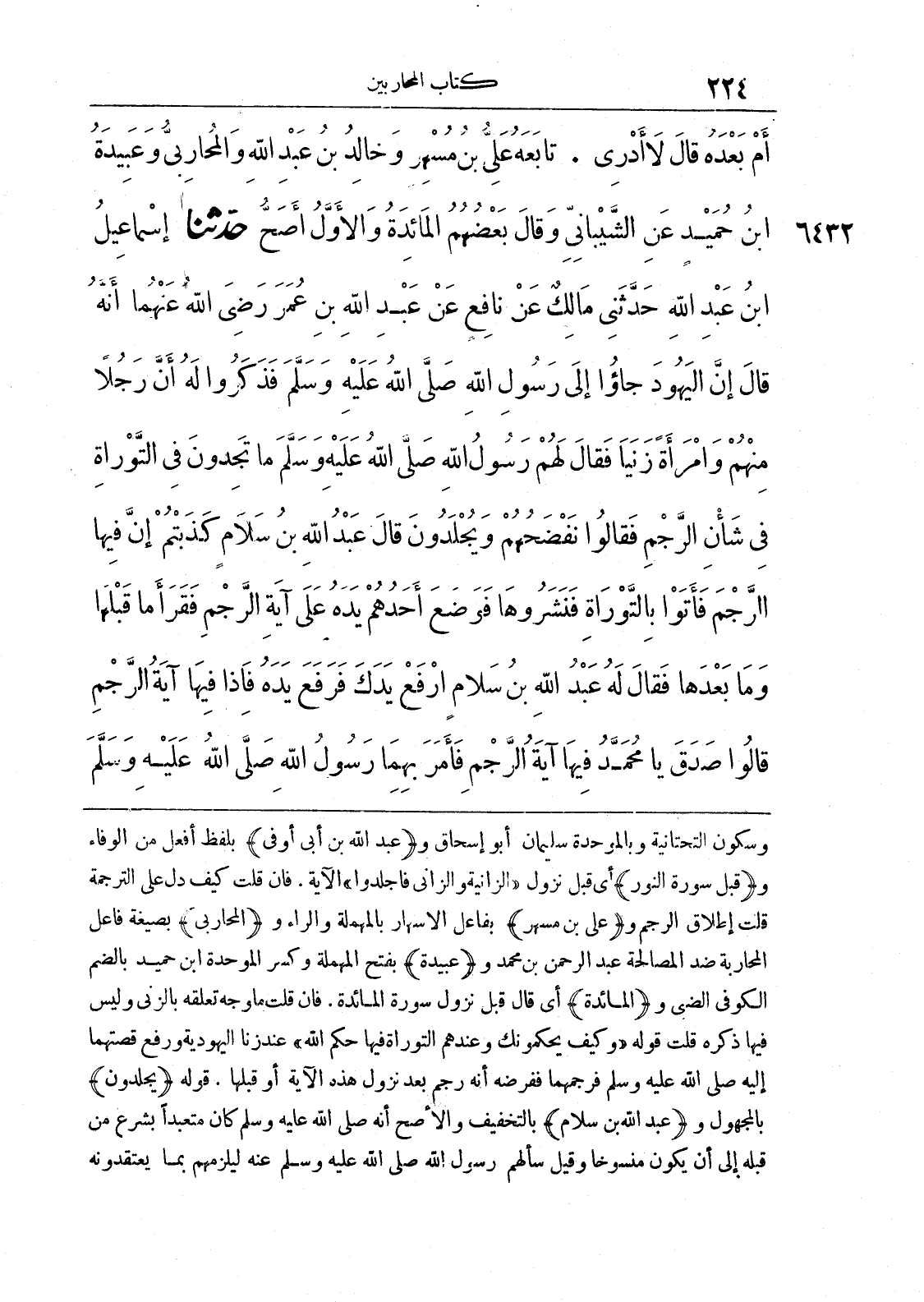 وسكون التحتانية وبالموحدة سليمان أبو إسحاق و (عبد الله بن أبي أوفى) بلفظ أفعل من الوفاء و (قبل سورة النور) أي قبل نزول «الزانية والزاني فاجلدوا» الآية، فإن قلت كيف دل على الترجمة قلت إطلاق الرجم و (علي بن مسهر) بفاعل الاسهار بالمهملة والراء و (المحاربي) بصيغة فاعل المحاربة ضد المصالحة عبد الرحمن بن محمد و (عبيدة) بفتح المهملة وكسر الموحدة ابن حميد بالضم الكوفي الضبي و (المائدة) أي قال قبل نزول سورة المائدة. فإن قلت ما وجه تعلقه بالزنا وليس فيها ذكره قلت قوله «وكيف يحكمونك وعندهم التوراة فيها حكم الله» عند زنا اليهودية ورفع قصتهما إليه صلى الله عليه وسلم فرجمهما ففرضه أنه رجم بعد نزول هذه الآية أو قبلها. قوله (يجلدون) بالمجهول و (عبد الله بن سلام) بالتخفيف والأصح أنه صلى الله عليه وسلم كان متعبدًا بشرع من قبله إلى أن يكون منسوخا وقيل سألهم رسول الله صلى الله عليه وسلم عنه ليلزمهم بما يعتقدونه.