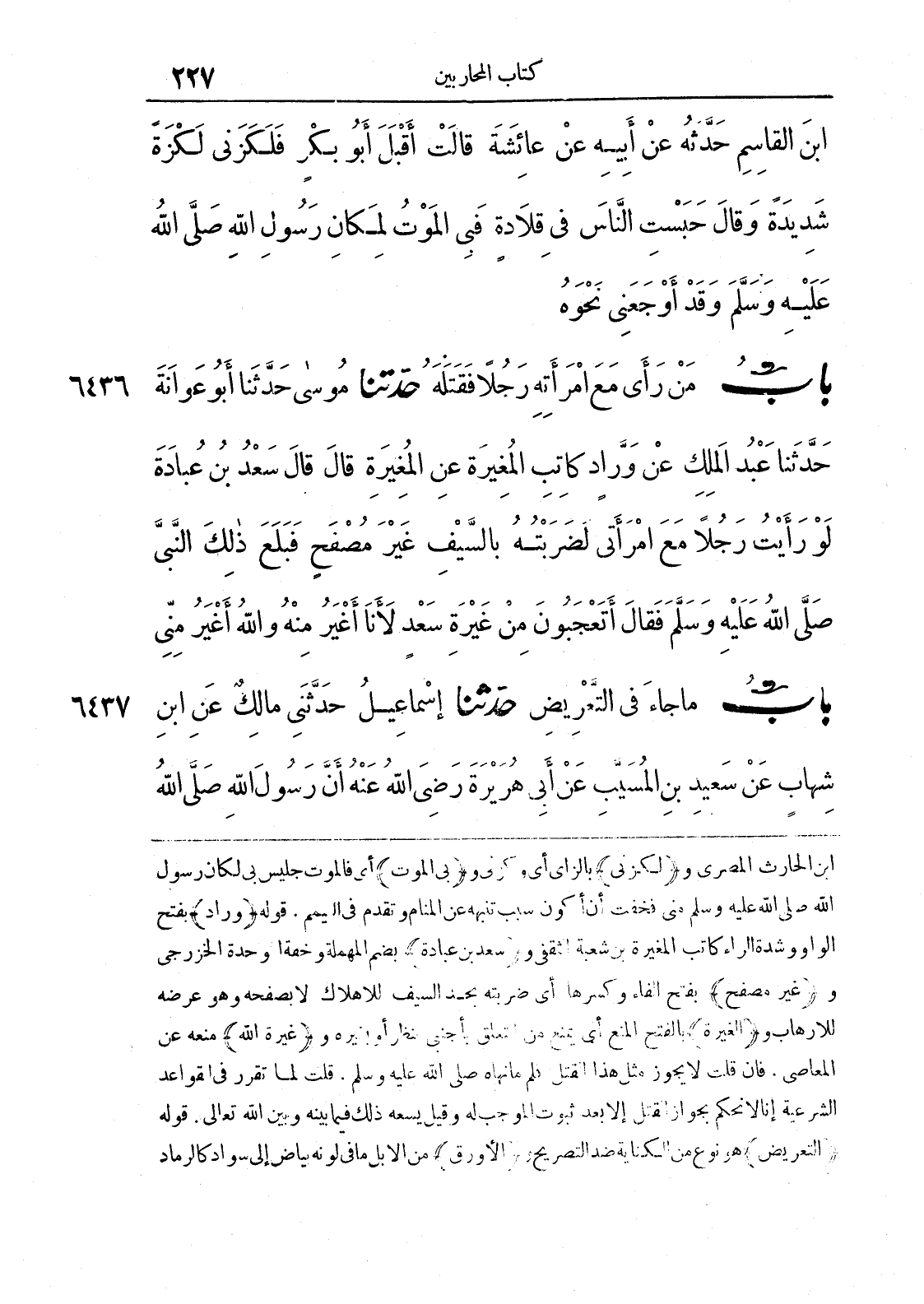 ابن الحارث المصري و (لكزني) بالزاي أي وكزني و (بي الموت) أي فالموت جليس بي لكان رسول الله صلى الله عليه وسلم مني فخفت أن أكون سبب تنبهه عن المنام وتقدم في التيمم، قوله (وراد) بفتح الواو وشدة الراء كاتب المغيرة بن شعبة الثقفي و (سعد بن عبادة) بضم المهملة وخفة الموحدة الخزرجي و (غير مصفح) بفتح الفاء وكسرها أي ضربته بحد السيف للإهلاك لا بصفحه وهو عرضه للإرهاب و (الغيرة) بالفتح المنع أي يمنع من التعلق بأجنبي بنظر أو بغيره و (غيرة الله) منعه عن المعاصي، فإن قلت لا يجوز مثل هذا القتل فلم ما نهاه صلى الله عليه وسلم، قلت لما تقرر في القواعد الشرعية إنا لا نحكم بجواز القتل إلا بعد ثبوت الموجب له وقيل يسعه ذلك فيما بينه وبين الله تعالى. قوله (التعريض) هو نوع من الكناية ضد التصريح و (الأورق) من الإبل ما في لونه بياض إلى سواد كالرماد