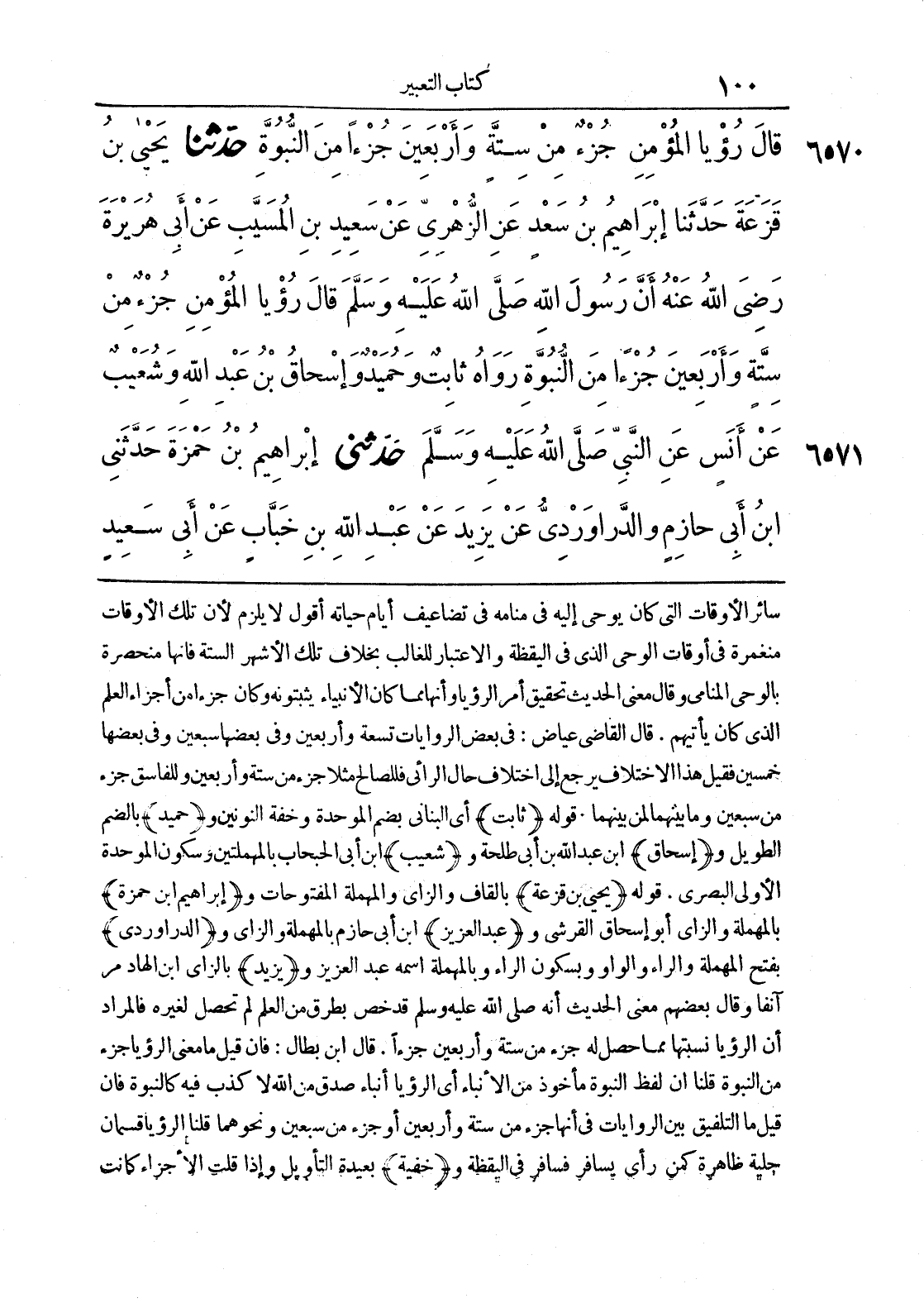 6570 - حَدَّثَنَا يَحْيَى بْنُ قَزَعَةَ حَدَّثَنَا إِبْرَاهِيمُ بْنُ سَعْدٍ عَنْ الزُّهْرِيِّ عَنْ سَعِيدِ بْنِ الْمُسَيَّبِ عَنْ أَبِي هُرَيْرَةَ رَضِيَ اللَّهُ عَنْهُ أَنَّ رَسُولَ اللَّهِ صَلَّى اللَّهُ عَلَيْهِ وَسَلَّمَ قَالَ رُؤْيَا الْمُؤْمِنِ جُزْءٌ مِنْ سِتَّةٍ وَأَرْبَعِينَ جُزْءًا مِنْ النُّبُوَّةِ وَرَوَاهُ ثَابِتٌ وَحُمَيْدٌ وَإِسْحَاقُ بْنُ عَبْدِ اللَّهِ وَشُعَيْبٌ عَنْ أَنَسٍ عَنْ النَّبِيِّ صَلَّى اللَّهُ عَلَيْهِ وَسَلَّمَ