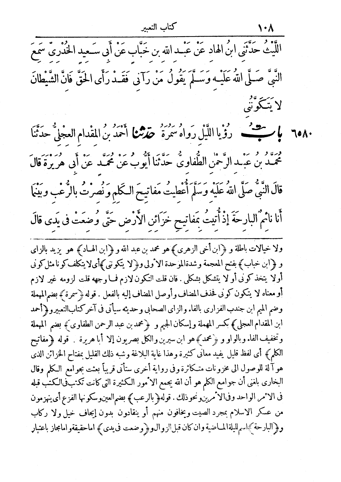 6580 - حَدَّثَنَا أَحْمَدُ بْنُ الْمِقْدَامِ الْعِجْلِيُّ حَدَّثَنَا مُحَمَّدُ بْنُ عَبْدِ الرَّحْمَنِ الطُّفَاوِيُّ حَدَّثَنَا أَيُّوبُ عَنْ مُحَمَّدٍ عَنْ أَبِي هُرَيْرَةَ قَالَ قَالَ النَّبِيُّ صَلَّى اللَّهُ عَلَيْهِ وَسَلَّمَ أُعْطِيتُ مَفَاتِيحَ الْكَلِمِ وَنُصِرْتُ بِالرُّعْبِ وَبَيْنَمَا أَنَا نَائِمٌ الْبَارِحَةَ إِذْ أُتِيتُ بِمَفَاتِيحِ خَزَائِنِ الْأَرْضِ حَتَّى وُضِعَتْ فِي يَدِي قَالَ