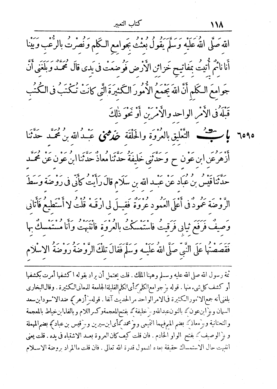 6595 - حَدَّثَنِي عَبْدُ اللَّهِ بْنُ مُحَمَّدٍ حَدَّثَنَا أَزْهَرُ عَنْ ابْنِ عَوْنٍ ح وحَدَّثَنِي خَلِيفَةُ حَدَّثَنَا مُعَاذٌ حَدَّثَنَا ابْنُ عَوْنٍ عَنْ مُحَمَّدٍ حَدَّثَنَا قَيْسُ بْنُ عُبَادٍ عَنْ عَبْدِ اللَّهِ بْنِ سَلَامٍ قَالَ رَأَيْتُ كَأَنِّي فِي رَوْضَةٍ وَوَسَطَ الرَّوْضَةِ عَمُودٌ فِي أَعْلَى الْعَمُودِ عُرْوَةٌ فَقِيلَ لِي ارْقَهْ قُلْتُ لَا أَسْتَطِيعُ فَأَتَانِي وَصِيفٌ فَرَفَعَ ثِيَابِي فَرَقِيتُ فَاسْتَمْسَكْتُ بِالْعُرْوَةِ فَانْتَبَهْتُ وَأَنَا مُسْتَمْسِكٌ بِهَا فَقَصَصْتُهَا عَلَى النَّبِيِّ صَلَّى اللَّهُ عَلَيْهِ وَسَلَّمَ فَقَالَ تِلْكَ الرَّوْضَةُ رَوْضَةُ الْإِسْلَامِ