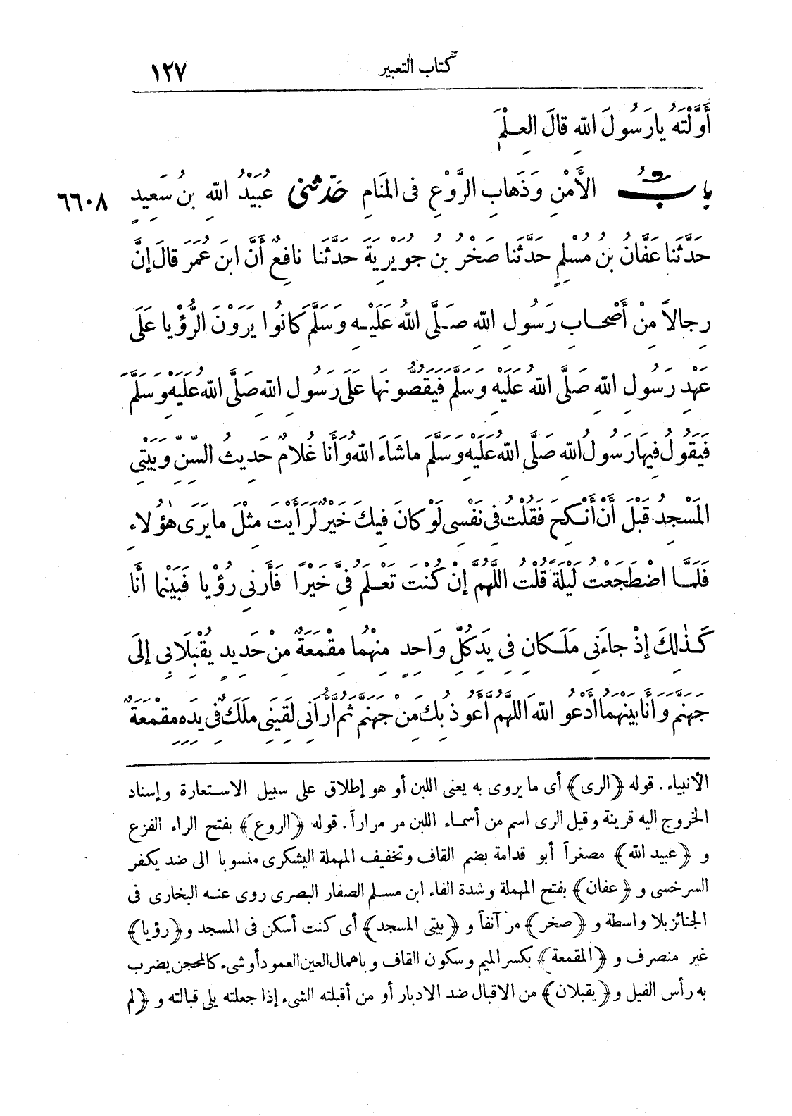 6608 - حَدَّثَنِي عُبَيْدُ اللَّهِ بْنُ سَعِيدٍ حَدَّثَنَا عَفَّانُ بْنُ مُسْلِمٍ حَدَّثَنَا صَخْرُ بْنُ جُوَيْرِيَةَ حَدَّثَنَا نَافِعٌ أَنَّ ابْنَ عُمَرَ قَالَ إِنَّ رِجَالًا مِنْ أَصْحَابِ رَسُولِ اللَّهِ صَلَّى اللَّهُ عَلَيْهِ وَسَلَّمَ كَانُوا يَرَوْنَ الرُّؤْيَا عَلَى عَهْدِ رَسُولِ اللَّهِ صَلَّى اللَّهُ عَلَيْهِ وَسَلَّمَ فَيَقُصُّونَهَا عَلَى رَسُولِ اللَّهِ صَلَّى اللَّهُ عَلَيْهِ وَسَلَّمَ فَيَقُولُ فِيهَا رَسُولُ اللَّهِ صَلَّى اللَّهُ عَلَيْهِ وَسَلَّمَ مَا شَاءَ اللَّهُ وَأَنَا غُلَامٌ حَدِيثُ السِّنِّ وَبَيْتِي الْمَسْجِدُ قَبْلَ أَنْ أَنْكِحَ فَقُلْتُ فِي نَفْسِي لَوْ كَانَ فِيكَ خَيْرٌ لَرَأَيْتَ مِثْلَ مَا يَرَى هَؤُلَاءِ فَلَمَّا اضْطَجَعْتُ ذَاتَ لَيْلَةٍ قُلْتُ اللَّهُمَّ إِنْ كُنْتَ تَعْلَمُ فِيَّ خَيْرًا فَأَرِنِي رُؤْيَا فَبَيْنَمَا أَنَا كَذَلِكَ إِذْ جَاءَنِي مَلَكَانِ فِي يَدِ كُلِّ وَاحِدٍ مِنْهُمَا مِقْمَعَةٌ مِنْ حَدِيدٍ يُقْبِلَانِ بِي إِلَى جَهَنَّمَ وَأَنَا بَيْنَهُمَا أَدْعُو اللَّهَ اللَّهُمَّ إِنِّي أَعُوذُ بِكَ مِنْ جَهَنَّمَ ثُمَّ أُرَانِي لَقِيَنِي مَلَكٌ فِي يَدِهِ مِقْمَعَةٌ