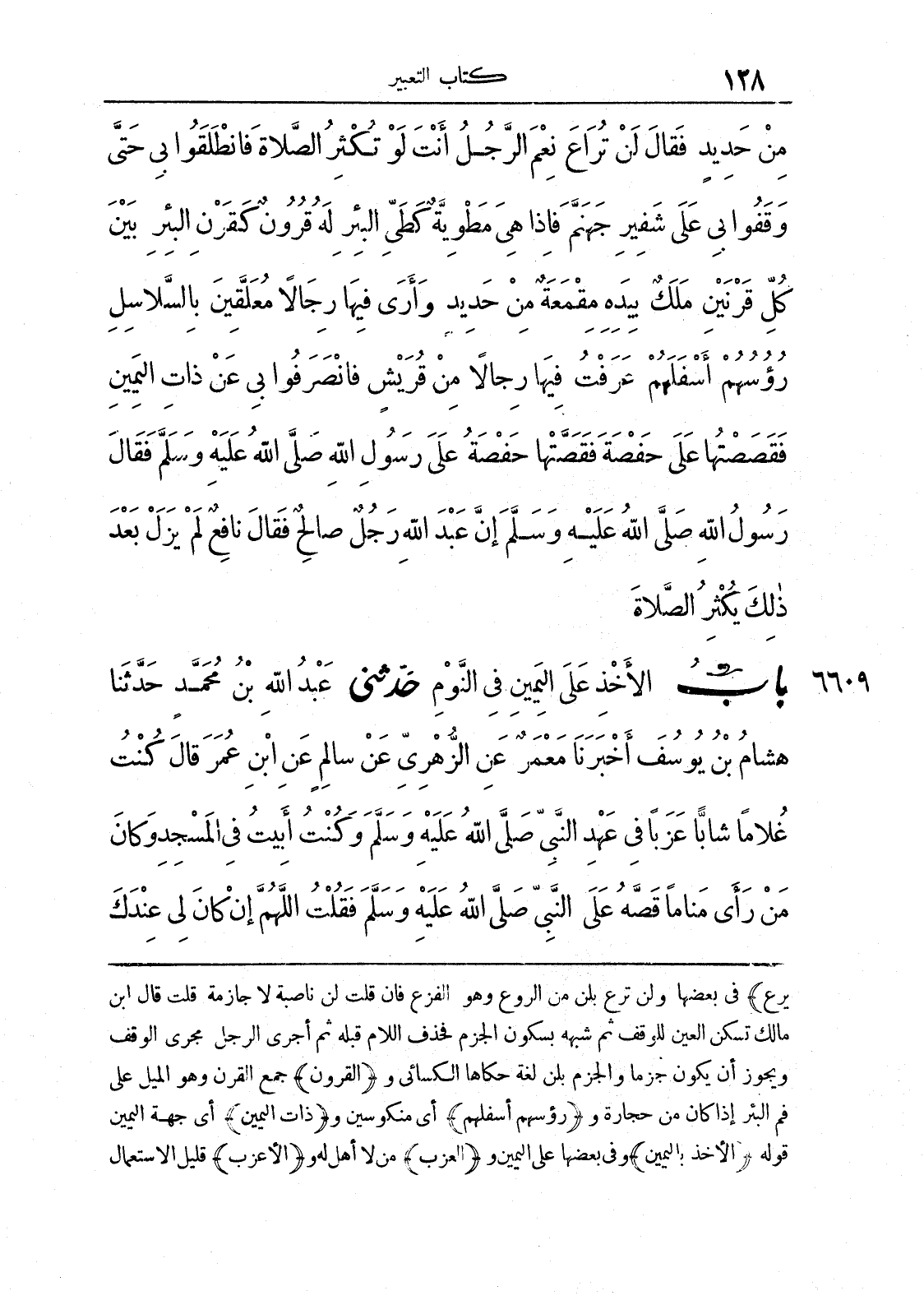 6609 - حَدَّثَنَا عَبْدُ اللَّهِ بْنُ مُحَمَّدٍ حَدَّثَنَا هِشَامُ بْنُ يُوسُفَ أَخْبَرَنَا مَعْمَرٌ عَنْ الزُّهْرِيِّ عَنْ سَالِمٍ عَنْ ابْنِ عُمَرَ قَالَ كُنْتُ غُلَامًا شَابًّا عَزَبًا فِي عَهْدِ النَّبِيِّ صَلَّى اللَّهُ عَلَيْهِ وَسَلَّمَ وَكُنْتُ أَبِيتُ فِي الْمَسْجِدِ وَكَانَ مَنْ رَأَى مَنَامًا قَصَّهُ عَلَى النَّبِيِّ صَلَّى اللَّهُ عَلَيْهِ وَسَلَّمَ فَقُلْتُ اللَّهُمَّ إِنْ كَانَ لِي عِنْدكَ