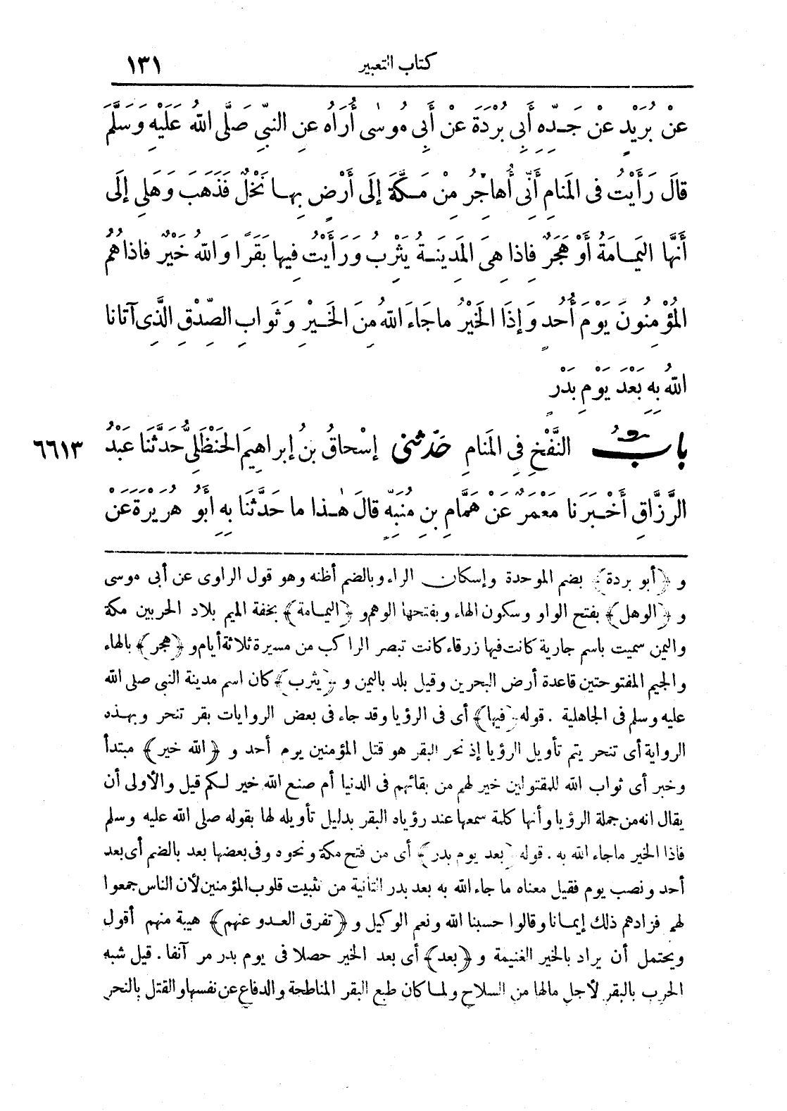 و (أبو بردة) بضم الموحدة وإسكان الراء وبالضم أظنه وهو قول الراوي عن أبي موسى و (الوهل) بفتح الواو وسكون الهاء وبفتحها الوهم و (اليمامة) بخفة الميم بلاد الحربين مكة واليمن سميت باسم جارية كانت فيها زرقاء كانت تبصر الراكب من مسيرة ثلاثة أيام و (هجر) بالهاء والجيم المفتوحتين قاعدة أرض البحرين وقيل بلد باليمن و (يثرب) كان اسم مدينة النبي صلى الله عليه وسلم في الجاهلية. قوله (فيها) أي في الرؤيا وقد جاء في بعض الروايات بقر تنحر ة بهذه الرواية أي تنحر يتم تأويل الرؤيا إذ نحر البقر هو قتل المؤمنين يوم أحد و (الله خير) مبتدأ وخبر أي ثواب الله للمقتولين خير لهم من بقائهم في الدنيا أم صنع الله خير لكم قيل والأولى أن يقال أنه من جملة الرؤيا وأنها كلمة سمعها عند رؤياه البقر بدليل تأويله لها بقوله صلى الله عليه وسلم فإذا الخير ما جاء الله به. قوله (بعد يوم بدر) أي من فتح مكة ونحوه وفي بعضها بعد بالضم أي بعد أحد ونصب يوم فقيل معناه ما جاء الله به بعد بدر الثانية من تثبيت قلوب المؤمنين لأن الناس جمعوا لهم فزادهم ذلك إيمانا وقالوا حسبنا ونعم الوكيل و (تفرق العدو عنهم) هيبة منهم أقول ويحتمل أن يراد بالخير الغنيمة و (بعد) أي بعد الخير حصلا في يوم مر آنفا، قيل شبه الحرب بالبقر لأجل ما لها من السلاح ولما كان طبع البقر المناطحة والدفاع عن نفسها والقتل بالنحر