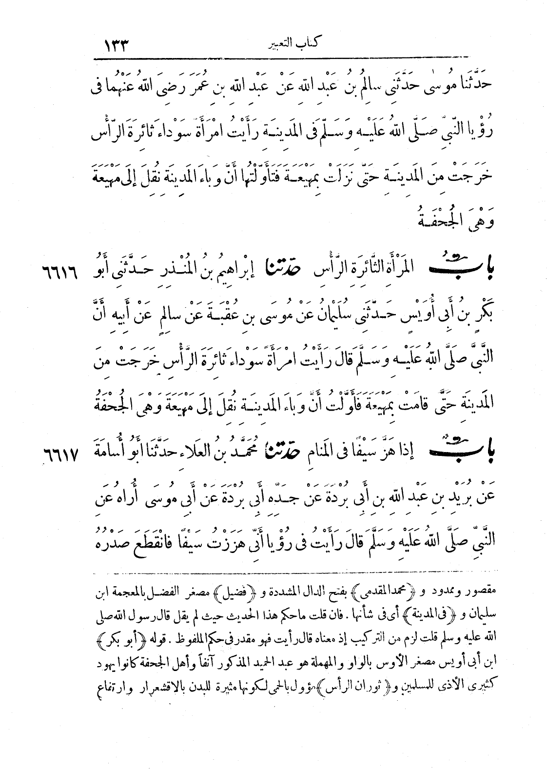 6617 - حَدَّثَنَا مُحَمَّدُ بْنُ الْعَلَاءِ حَدَّثَنَا أَبُو أُسَامَةَ عَنْ بُرَيْدِ بْنِ عَبْدِ اللَّهِ بْنِ أَبِي بُرْدَةَ عَنْ جَدِّهِ أَبِي بُرْدَةَ عَنْ أَبِي مُوسَى أُرَاهُ عَنْ النَّبِيِّ صَلَّى اللَّهُ عَلَيْهِ وَسَلَّمَ قَالَ رَأَيْتُ فِي رُؤْيَايَ أَنِّي هَزَزْتُ سَيْفًا فَانْقَطَعَ صَدْرُهُ