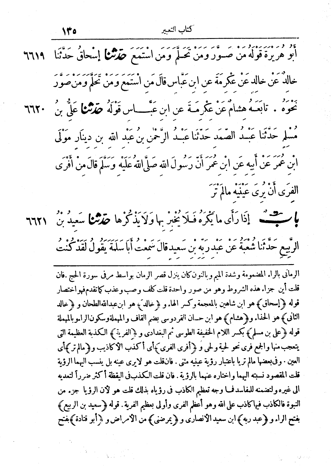 الرماني بالراء المضمومة وشدة الميم وبالنون كان ينزل قصر الرمان بواسط مر في سورة الحج. فان قلت أين جزاء هذه الشروط وهو من صور واحدة قلت كلف وصب وعذب كما تقدم فهو اختصار قوله (إسحاق) هو ابن شاهين بالمعجمة وكسر الهاء و (خالد) هو ابن عبد الله الطحان و (خالد الثاني) هو الحذاء و (هشام) هو ابن حسان القردوسي بضم القاف والمهملة وسكون الراء وبالمهملة قوله (علي بن مسلم) بكسر اللام الخفيفة الطوسي ثم البغدادي و (الفرية) الكذبة العظيمة التي يتعجب منها والجمع فرى نحو لحية ولحي و (أفرى الفرى) أي أكذب الأكاذيب و (ما لم تر) أي العين، وفي بعضها ما لم تريا باعتبار رؤية عينيه مثنى. فإن قلت هو لا يرى عينه بل ينسب اليهما الرؤية قلت المقصود نسبته اليهما واختاره عنهما بالرؤية، فإن قلت الكذب في اليقظة أكثر ضررا لتعديه إلى غيره ولتضمنه للمفاسد فما وجه تعظيم الكاذب في رؤياه بذلك قلت هو لأن الرؤيا جزء من النبوة فالكاذب فيها كاذب على الله وهو أعظم الفري وأولى بعظيم الفرية. قوله (سعيد بن الربيع) بفتح الراء و (عبد ربه) ابن سعيد الأنصاري و (يمرضني) من الأمراض و (أبو قتادة) بفتح