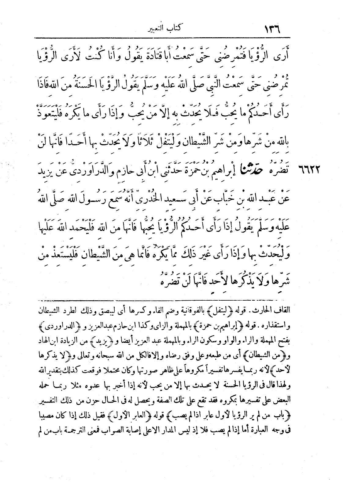 6622 - حَدَّثَنَا إِبْرَاهِيمُ بْنُ حَمْزَةَ حَدَّثَنِي ابْنُ أَبِي حَازِمٍ وَالدَّرَاوَرْدِيُّ عَنْ يَزِيدَ بْنِ عَبْدِ اللَّهِ بْنِ أُسَامَةَ بْنِ الْهَادِ اللَّيْثِيِّ عَنْ عَبْدِ اللَّهِ بْنِ خَبَّابٍ عَنْ أَبِي سَعِيدٍ الْخُدْرِيِّ أَنَّهُ سَمِعَ رَسُولَ اللَّهِ صَلَّى اللَّهُ عَلَيْهِ وَسَلَّمَ يَقُولُ إِذَا رَأَى أَحَدُكُمْ الرُّؤْيَا يُحِبُّهَا فَإِنَّهَا مِنْ اللَّهِ فَلْيَحْمَدْ اللَّهَ عَلَيْهَا وَلْيُحَدِّثْ بِهَا وَإِذَا رَأَى غَيْرَ ذَلِكَ مِمَّا يَكْرَهُ فَإِنَّمَا هِيَ مِنْ الشَّيْطَانِ فَلْيَسْتَعِذْ مِنْ شَرِّهَا وَلَا يَذْكُرْهَا لِأَحَدٍ فَإِنَّهَا لَنْ تَضُرَّهُ