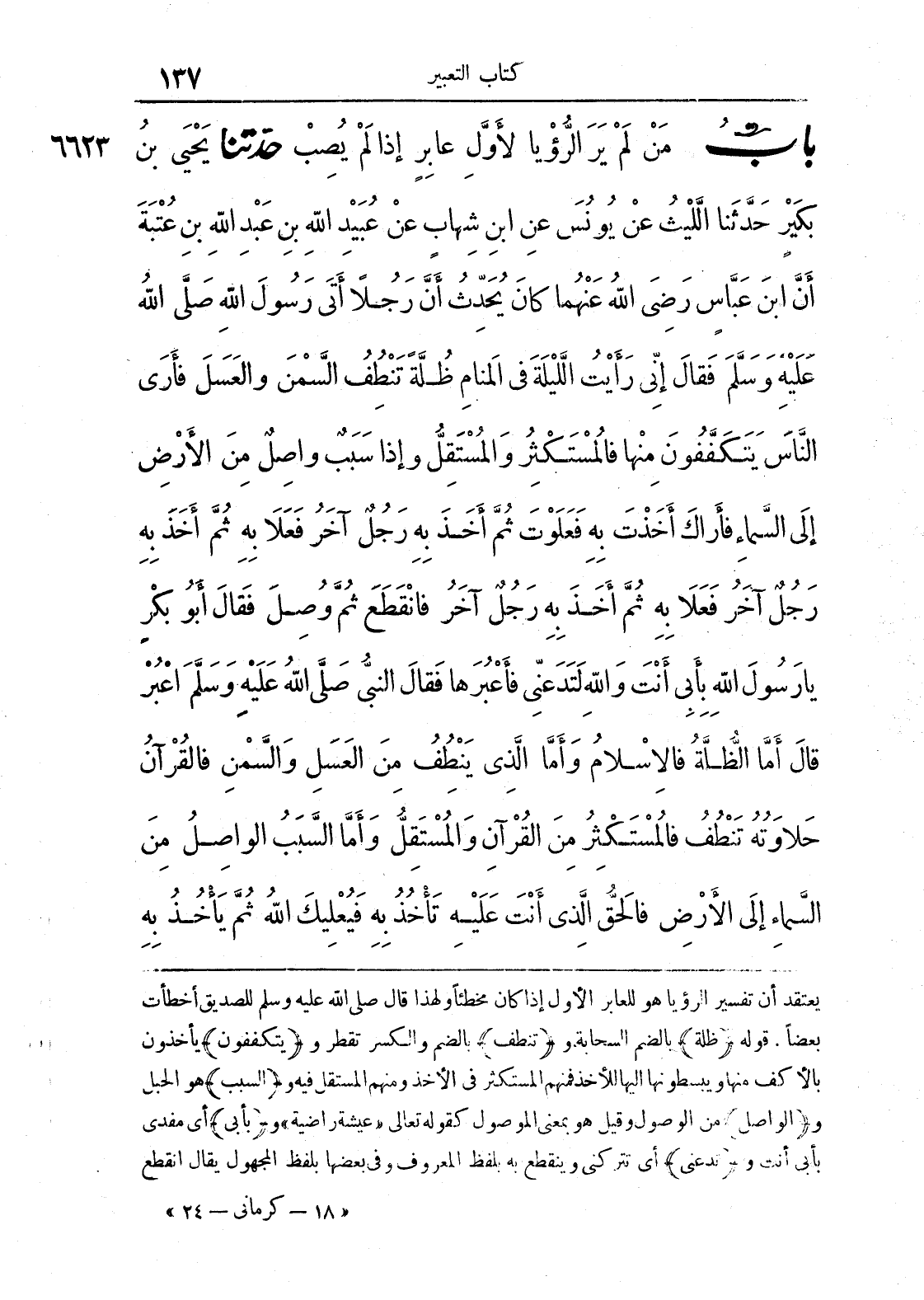 6623 - حَدَّثَنَا يَحْيَى بْنُ بُكَيْرٍ حَدَّثَنَا اللَّيْثُ عَنْ يُونُسَ عَنْ ابْنِ شِهَابٍ عَنْ عُبَيْدِ اللَّهِ بْنِ عَبْدِ اللَّهِ بْنِ عُتْبَةَ أَنَّ ابْنَ عَبَّاسٍ رَضِيَ اللَّهُ عَنْهُمَا كَانَ يُحَدِّثُ أَنَّ رَجُلًا أَتَى رَسُولَ اللَّهِ صَلَّى اللَّهُ عَلَيْهِ وَسَلَّمَ فَقَالَ إِنِّي رَأَيْتُ اللَّيْلَةَ فِي الْمَنَامِ ظُلَّةً تَنْطُفُ السَّمْنَ وَالْعَسَلَ فَأَرَى النَّاسَ يَتَكَفَّفُونَ مِنْهَا فَالْمُسْتَكْثِرُ وَالْمُسْتَقِلُّ وَإِذَا سَبَبٌ وَاصِلٌ مِنْ الْأَرْضِ إِلَى السَّمَاءِ فَأَرَاكَ أَخَذْتَ بِهِ فَعَلَوْتَ ثُمَّ أَخَذَ بِهِ رَجُلٌ آخَرُ فَعَلَا بِهِ ثُمَّ أَخَذَ بِهِ رَجُلٌ آخَرُ فَعَلَا بِهِ ثُمَّ أَخَذَ بِهِ رَجُلٌ آخَرُ فَانْقَطَعَ ثُمَّ وُصِلَ فَقَالَ أَبُو بَكْرٍ يَا رَسُولَ اللَّهِ بِأَبِي أَنْتَ وَاللَّهِ لَتَدَعَنِّي فَأَعْبُرَهَا فَقَالَ النَّبِيُّ صَلَّى اللَّهُ عَلَيْهِ وَسَلَّمَ اعْبُرْهَا قَالَ أَمَّا الظُّلَّةُ فَالْإِسْلَامُ وَأَمَّا الَّذِي يَنْطُفُ مِنْ الْعَسَلِ وَالسَّمْنِ فَالْقُرْآنُ حَلَاوَتُهُ تَنْطُفُ فَالْمُسْتَكْثِرُ مِنْ الْقُرْآنِ وَالْمُسْتَقِلُّ وَأَمَّا السَّبَبُ الْوَاصِلُ مِنْ السَّمَاءِ إِلَى الْأَرْضِ فَالْحَقُّ الَّذِي أَنْتَ عَلَيْهِ تَاخُذُ بِهِ فَيُعْلِيكَ اللَّهُ ثُمَّ يَاخُذُ بِهِ ...
