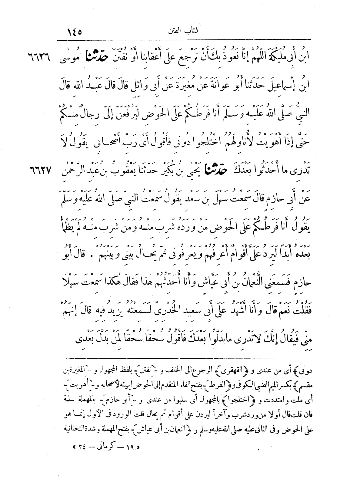 6627 - حَدَّثَنَا يَحْيَى بْنُ بُكَيْرٍ حَدَّثَنَا يَعْقُوبُ بْنُ عَبْدِ الرَّحْمَنِ عَنْ أَبِي حَازِمٍ قَالَ سَمِعْتُ سَهْلَ بْنَ سَعْدٍ يَقُولُ سَمِعْتُ النَّبِيَّ صَلَّى اللَّهُ عَلَيْهِ وَسَلَّمَ يَقُولُ أَنَا فَرَطُكُمْ عَلَى الْحَوْضِ فَمَنْ وَرَدَهُ شَرِبَ مِنْهُ وَمَنْ شَرِبَ مِنْهُ لَمْ يَظْمَا بَعْدَهُ أَبَدًا لَيَرِدُ عَلَيَّ أَقْوَامٌ أَعْرِفُهُمْ وَيَعْرِفُونِي ثُمَّ يُحَالُ بَيْنِي وَبَيْنَهُمْ قَالَ أَبُو حَازِمٍ فَسَمِعَنِي النُّعْمَانُ بْنُ أَبِي عَيَّاشٍ وَأَنَا أُحَدِّثُهُمْ هَذَا فَقَالَ هَكَذَا سَمِعْتَ سَهْلًا فَقُلْتُ نَعَمْ قَالَ وَأَنَا أَشْهَدُ عَلَى أَبِي سَعِيدٍ الْخُدْرِيِّ لَسَمِعْتُهُ يَزِيدُ فِيهِ قَالَ إِنَّهُمْ مِنِّي فَيُقَالُ إِنَّكَ لَا تَدْرِي مَا بَدَّلُوا بَعْدَكَ فَأَقُولُ سُحْقًا سُحْقًا لِمَنْ بَدَّلَ بَعْدِي