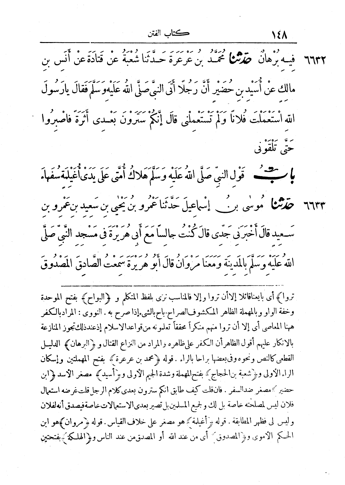 تروا) أي بايعنا قائلا إلا أن تروا وإلا فالمناسب ترى بلفظ المتكلم و (البواح) بفتح الموحدة وخفة الواو وبالمهملة الظاهر المكشوف الصراح , باح بالشيء إذا صرح به, النووي: المراد بالكفر ههنا المعاصي أي إلا أن تروا منهم منكرا محققا تعلمونه من قواعد الإسلام إذ عند ذلك تجوز المنازعة بالإنكار عليهم أقول الظاهر أن الكفر على ظاهره والمراد من النزاع القتال و (البرهان) الدليل القطعي كالنص ونحوه وفي بعضها براحا بالراء , قوله (محمد بن عرعرة) بفتح المهملتين وإسكان الراء الأولى و (شعبة بن الحجاج) بفتح المهملة وشدة الجيم الأولى و (أسيد) مصغر الأسد (ابن حضير) مصغر ضد السفر, فان قلت كيف طابق إنكم سترون بعدى كلام الرجل قلت غرضه استعمال فلان ليس لمصلحته خاصة بل لك ولجميع المسلمين بل تصير بعدى استعمالات خاصة فيصدق أنه لفلان وليس لي فظهر المطابقة , قوله (أغيلمة) هو مصغر على خلاف القياس , قوله (مروان) هو ابن الحكم الأموي و (المصدوق) أي من عند الله أو المصدق من عند الناس و (الهلكة) بفتحتين