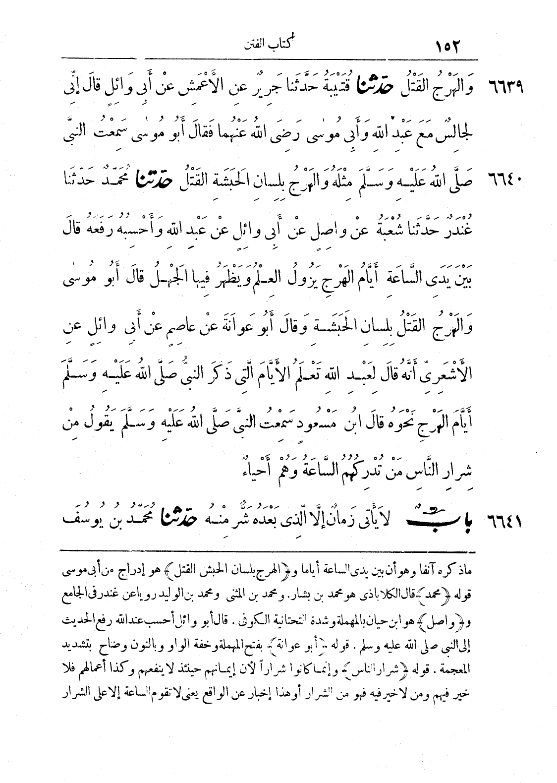 ما ذكره آنفا وهو أن بين يدي الساعة أياما و (الهرج بلسان الحبش القتل) هو إدراج من أبي موسى قوله (محمد) قال الكلاباذي هو محمد بن يشار, ومحمد بن المثنى ومحمد بن الوليد رويا عن غندر في الجامع و (واصل) هو ابن حيان بالمهملة وشدة التحتانية الكوفي, قال أبو وائل أحسب عند الله رفع الحديث إلى النبي صلى الله عليه وسلم، قوله (أبو عوانة) بفتح المهملة وخفة الواو وبالنون وضاح بتشديد المعجمة، قوله (شرار الناس) وإنما كانوا شرارا لان إيمانهم حينئذ لا ينفعهم وكذا أعمالهم فلا خير فيهم ومن لا خير فيه فهو من الشرار أو هذا إخبار عن الواقع يعني لا تقوم الساعة إلا على الشرار