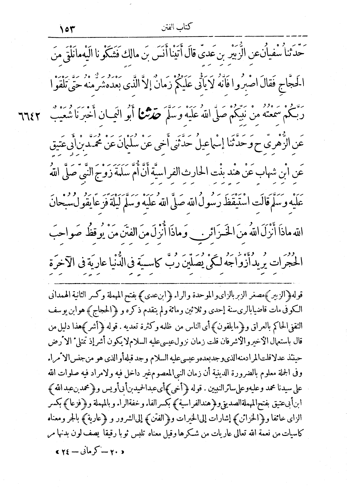 قوله (الزبير) مصغر الزبر بالزاي والموحدة والراء (ابن عدي) بفتح المهملة وكسر الثانية الهمداني الكوفي مات قاضيا بالري سنة إحدى وثلاثين ومائة ولم يتقدم ذكره و (الحجاج) هو ابن يوسف الثقفي الحاكم بالعراق و (ما يلقون) أي الناس من ظلمه وكثرة تعديه, قوله (أشر) هذا دليل من قال باستعمال الأخير والأشر فان قلت زمان نزول عيسى عليه السلام لا يكون أشر إذ تمتلئ الأرض حينئذ عدلا قلت المراد منه الذي وجد بعده وعيسى عليه السلام وجد قبله أو الذي هو من جنس الأمراء وفي الجملة معلوم بالضرورة الدينية أن زمان النبي المعصوم غير داخل فيه ولا مراد منه صلوات الله على سيدنا محمد وعليه وعلى سائر النبيين, قوله (أخي) أي عبد الحميد بن أبي أويس و (محمد بن عبد الله) ابن أبي عتيق بفتح المهملة الصديقي و (هند الفراسية) بكسر الفاء وخفة الراء وبالمهملة و (فزعا) بكسر الزاي خائفا و (الخزائن) إشارات إلى الخيرات و (الفتن) إلى الشرور و (عارية) بالجر ومعناه كاسيات من نعمة الله تعالى عاريات من شكرها وقيل معناه تلبس ثوبا رقيقا يصف لون بدنها مر