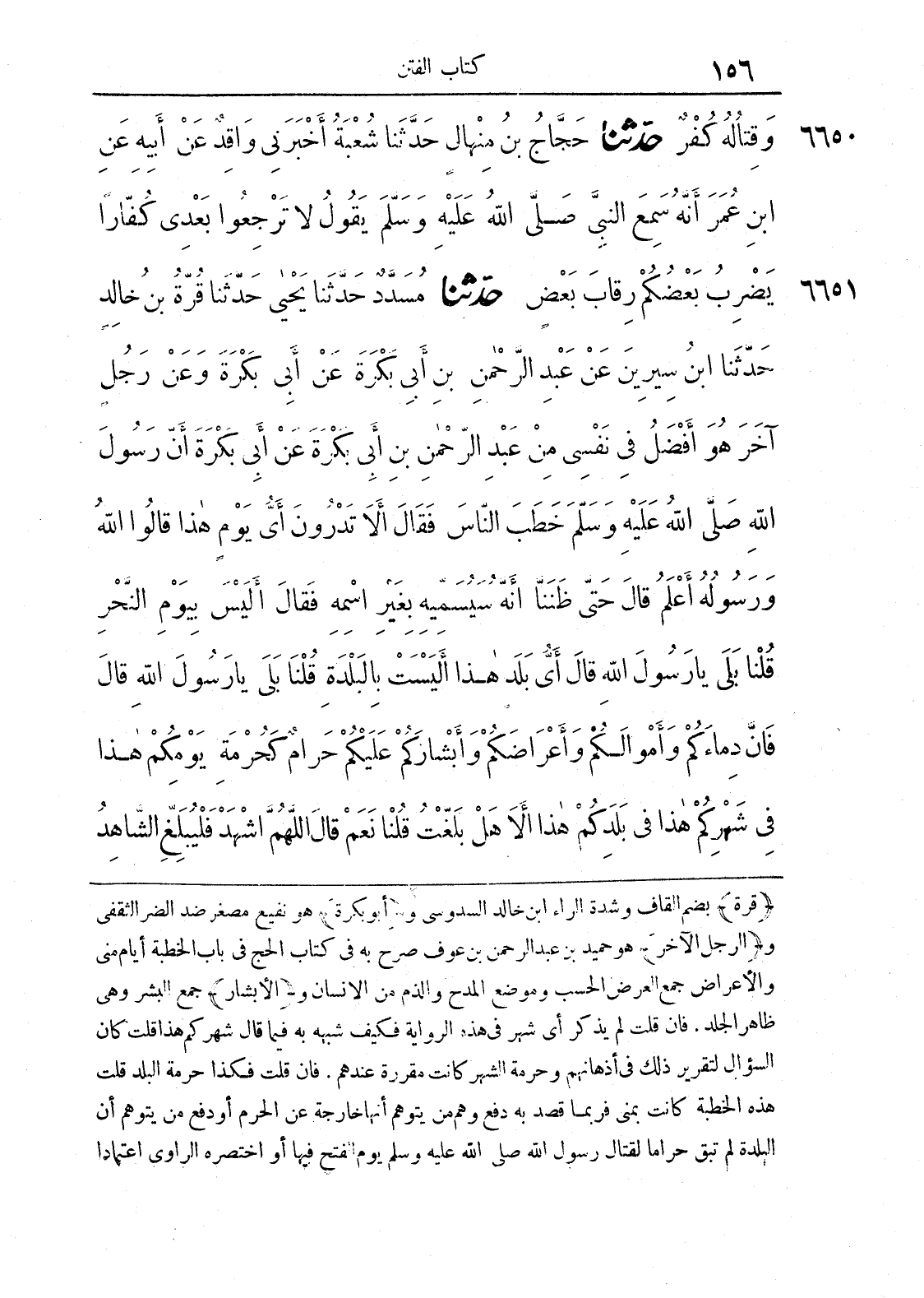 6650 - حَدَّثَنَا حَجَّاجُ بْنُ مِنْهَالٍ حَدَّثَنَا شُعْبَةُ أَخْبَرَنِي وَاقِدُ بْنُ مُحَمَّدٍ عَنْ أَبِيهِ عَنْ ابْنِ عُمَرَ أَنَّهُ سَمِعَ النَّبِيَّ صَلَّى اللَّهُ عَلَيْهِ وَسَلَّمَ يَقُولُ لَا تَرْجِعُوا بَعْدِي كُفَّارًا يَضْرِبُ بَعْضُكُمْ رِقَابَ بَعْضٍ