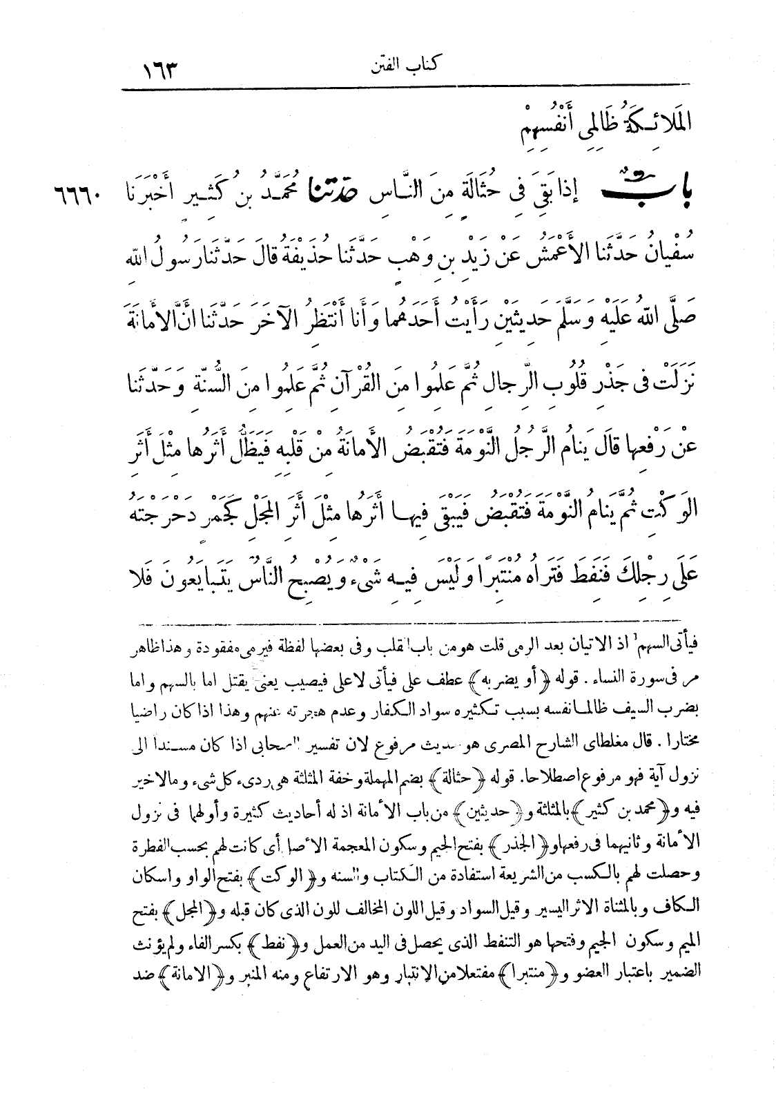 6660 - حَدَّثَنَا مُحَمَّدُ بْنُ كَثِيرٍ أَخْبَرَنَا سُفْيَانُ حَدَّثَنَا الْأَعْمَشُ عَنْ زَيْدِ بْنِ وَهْبٍ حَدَّثَنَا حُذَيْفَةُ قَالَ حَدَّثَنَا رَسُولُ اللَّهِ صَلَّى اللَّهُ عَلَيْهِ وَسَلَّمَ حَدِيثَيْنِ رَأَيْتُ أَحَدَهُمَا وَأَنَا أَنْتَظِرُ الْآخَرَ حَدَّثَنَا أَنَّ الْأَمَانَةَ نَزَلَتْ فِي جَذْرِ قُلُوبِ الرِّجَالِ ثُمَّ عَلِمُوا مِنْ الْقُرْآنِ ثُمَّ عَلِمُوا مِنْ السُّنَّةِ وَحَدَّثَنَا عَنْ رَفْعِهَا قَالَ يَنَامُ الرَّجُلُ النَّوْمَةَ فَتُقْبَضُ الْأَمَانَةُ مِنْ قَلْبِهِ فَيَظَلُّ أَثَرُهَا مِثْلَ أَثَرِ الْوَكْتِ ثُمَّ يَنَامُ النَّوْمَةَ فَتُقْبَضُ فَيَبْقَى فِيهَا أَثَرُهَا مِثْلَ أَثَرِ الْمَجْلِ كَجَمْرٍ دَحْرَجْتَهُ عَلَى رِجْلِكَ فَنَفِطَ فَتَرَاهُ مُنْتَبِرًا وَلَيْسَ فِيهِ شَيْءٌ وَيُصْبِحُ النَّاسُ يَتَبَايَعُونَ فَلَا