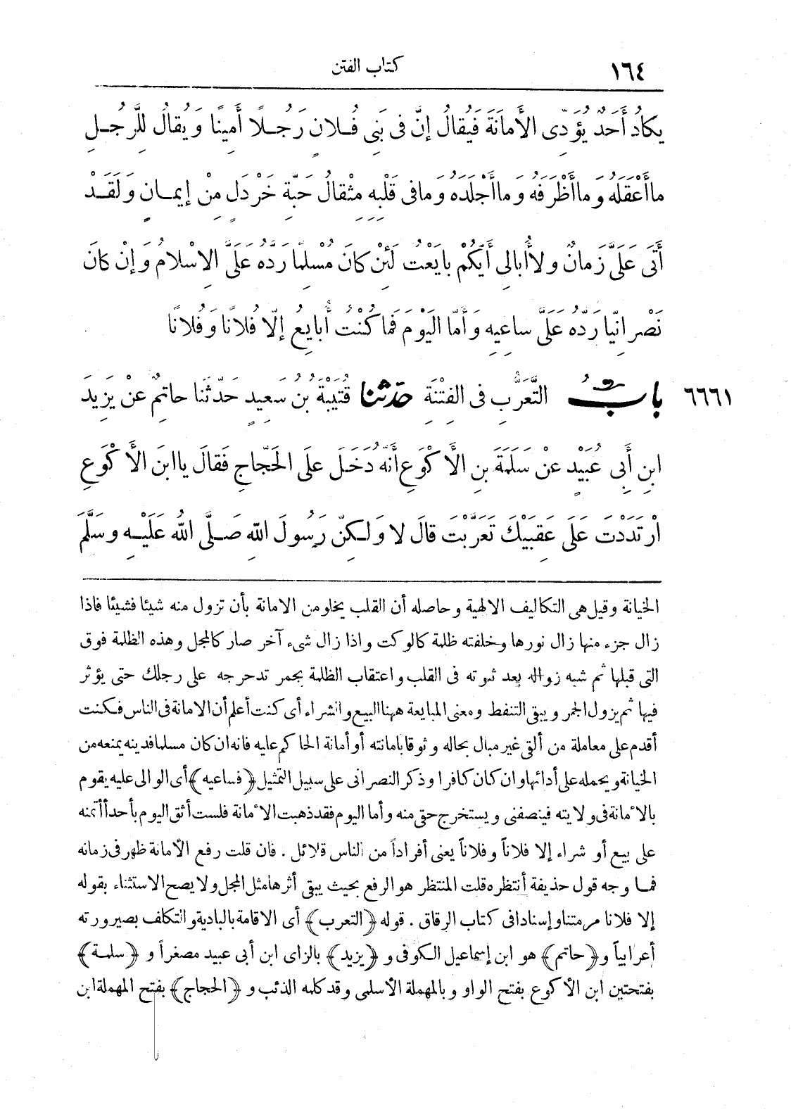 الخيانة وقيل هي التكاليف الإلهية وحاصله أن القلب يخلو من الأمانة بأن تزول منه شيئا فشيئا فإذا زال جزء منها نورها وخلفته ظلمة كالوكت وإذا زال شيء آخر كالمجل وهذه الظلمة فوق التي قبلها ثم شبه زوال بعد ثبوته في القلب واعتقاب الظلمة بجمر تدحرجه على رجلك حتى يؤثر فيها ثم يزول الجمر ويبقى التنفط ومعنى المبايعة ههنا البيع والشراء أي كنت أعلم أن الأمانة في الناس فكنت أقدم على معاملة من ألقى غير مبال بحاله وثوقا بأمانته أو أمانة الحاكم عليه فأنه كان مسلما فدينه يمنعه من الخيانة ويحمله على أدائها وان كان كافرا وذكر النصراني على سبيل التمثيل (فساعيه) أي الوالي عليه يقوم بالأمانة في ولايته فينصفني ويستخرج حقي منه وأما اليوم فقد ذهبت الأمانة فلست أثق اليوم بأحد أأتمنه على بيع أو شراء إلا فلانا وفلانا يعني أفرادا من الناس قلائل , فات قلت رفع الأمانة ظهر في زمانه فما وجه قول حذيفة أنتظره قلت المنتظر هو الرفع بحيث يبقى أثرها مثل المجل ولا يصح الاستثناء بقوله إلا فلانا مر متنا وإسنادا في كتاب الرقاق , قوله (التعرب) أي الإقامة بالبادية والتكلف بصيرورته أعرابيا و (حاتم) هو ابن إسماعيل الكوفي و (يزيد) بالزاي ابن أبى عبيد مصغرا و (سلمة) بفتحتين ابن الأكوع بفتح الواو وبالمهملة الأسلمي وقد كلمه الذئب و (الحجاج) بفتح المهملة ابن