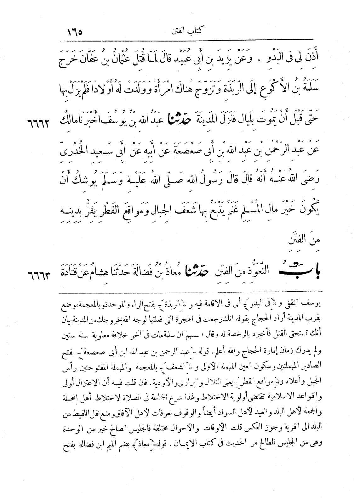 يوسف الثقفي و (في البدو) أي في الإقامة فيه و (الربدة) بفتح الراء والموحدة وبالمعجمة موضع بقرب المدينة أراد الحجاج بقوله أنك رجعت في الهجرة التي فعلتها لوجه الله بخروجك من المدينة بيان انك تستحق القتل فأخبره بالرخصة له وقال بعضهم أن سلمة مات في آخر خلافة معاوية سنة ستين ولم يدرك زمان إمارة الحجاج والله أعلم , قوله (عبد الرحمن بن عبد الله ابن أبي صعصعة) بفتح الصادين المهملتين وسكون العين المهملة الأولى و (الشعف) بالمعجمة والمهملة المفتوحتين رأس الجبل وأعلاه و (مواقع القطر) يعني التلال والبراري والأودية , فان قلت فيه أن الاعتزال أولى والقواعد الإسلامية تقتضي أولوية الاختلاط ولهذا شرع الجماعة في الصلاة لاختلاط أهل المحلة والجمعة لأهل البلد والعيد لأهل السواد أيضا والوقوف بعرفات لأهل الآفاق ومنع نقل اللقيط من البلد إلى القرية وجوز العكس قلت الأوقات والأحوال مختلفة فالجليس الصالح خير من الوحدة وهي من الجليس الطالح مر الحديث في كتاب الإيمان , قوله (معاذ) بضم الميم ابن فضالة بفتح