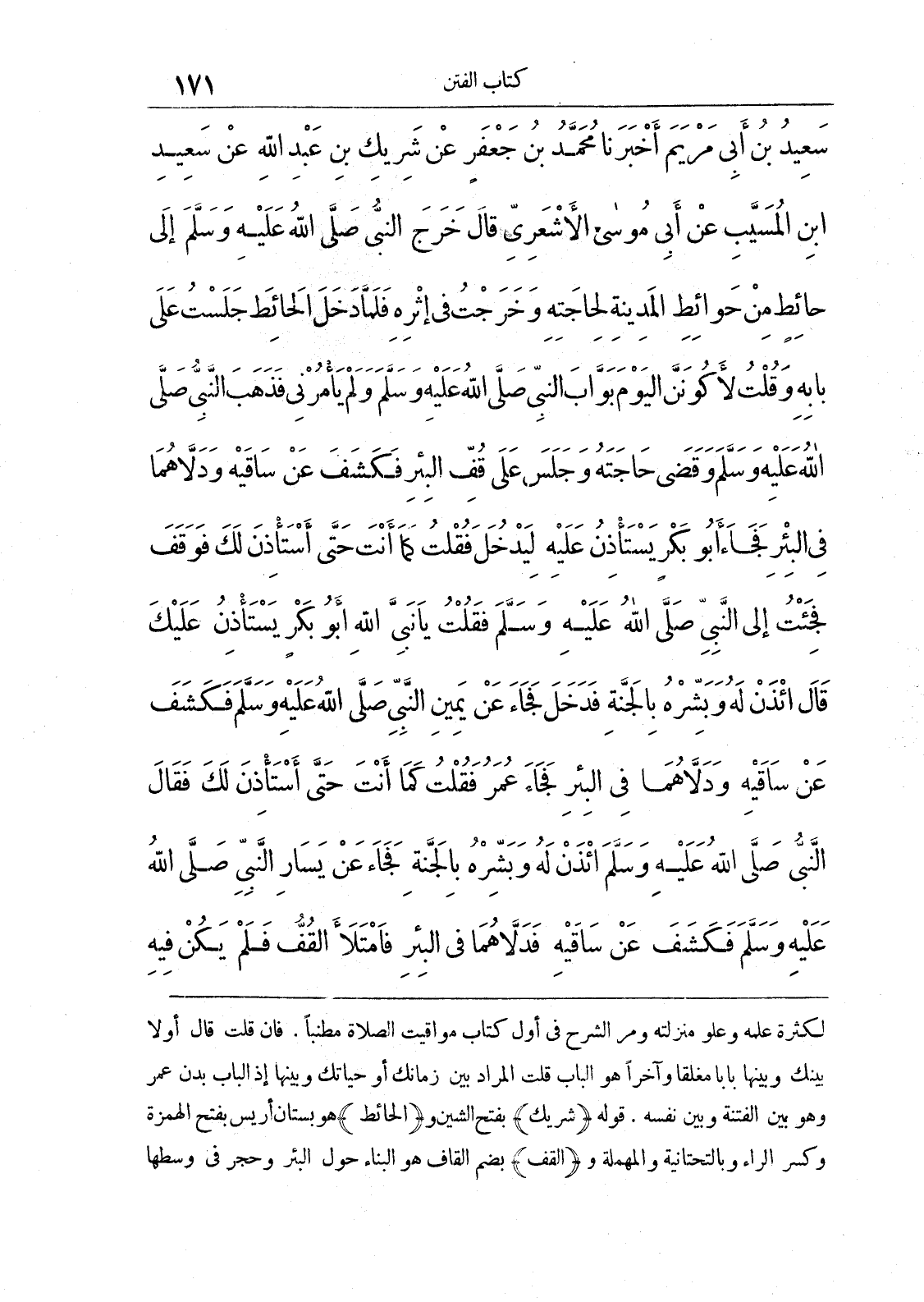 سَعِيدُ بْنُ أَبِي مَرْيَمَ أَخْبَرَنَا مُحَمَّدُ بْنُ جَعْفَرٍ عَنْ شَرِيكِ بْنِ عَبْدِ اللَّهِ عَنْ سَعِيدِ بْنِ الْمُسَيَّبِ عَنْ أَبِي مُوسَى الْأَشْعَرِيِّ قَالَ خَرَجَ النَّبِيُّ صَلَّى اللَّهُ عَلَيْهِ وَسَلَّمَ يَوْمًا إِلَى حَائِطٍ مِنْ حَوَائِطِ الْمَدِينَةِ لِحَاجَتِهِ وَخَرَجْتُ فِي إِثْرِهِ فَلَمَّا دَخَلَ الْحَائِطَ جَلَسْتُ عَلَى بَابِهِ وَقُلْتُ لَأَكُونَنَّ الْيَوْمَ بَوَّابَ النَّبِيِّ صَلَّى اللَّهُ عَلَيْهِ وَسَلَّمَ وَلَمْ يَامُرْنِي فَذَهَبَ النَّبِيُّ صَلَّى اللَّهُ عَلَيْهِ وَسَلَّمَ وَقَضَى حَاجَتَهُ وَجَلَسَ عَلَى قُفِّ الْبِئْرِ فَكَشَفَ عَنْ سَاقَيْهِ وَدَلَّاهُمَا فِي الْبِئْرِ فَجَاءَ أَبُو بَكْرٍ يَسْتَاذِنُ عَلَيْهِ لِيَدْخُلَ فَقُلْتُ كَمَا أَنْتَ حَتَّى أَسْتَاذِنَ لَكَ فَوَقَفَ فَجِئْتُ إِلَى النَّبِيِّ صَلَّى اللَّهُ عَلَيْهِ وَسَلَّمَ فَقُلْتُ يَا نَبِيَّ اللَّهِ أَبُو بَكْرٍ يَسْتَاذِنُ عَلَيْكَ قَالَ ائْذَنْ لَهُ وَبَشِّرْهُ بِالْجَنَّةِ فَدَخَلَ فَجَاءَ عَنْ يَمِينِ النَّبِيِّ صَلَّى اللَّهُ عَلَيْهِ وَسَلَّمَ فَكَشَفَ عَنْ سَاقَيْهِ وَدَلَّاهُمَا فِي الْبِئْرِ فَجَاءَ عُمَرُ فَقُلْتُ كَمَا أَنْتَ حَتَّى أَسْتَاذِنَ لَكَ فَقَالَ النَّبِيُّ صَلَّى اللَّهُ عَلَيْهِ وَسَلَّمَ ائْذَنْ لَهُ وَبَشِّرْهُ بِالْجَنَّةِ فَجَاءَ عَنْ يَسَارِ النَّبِيِّ صَلَّى اللَّهُ عَلَيْهِ وَسَلَّمَ فَكَشَفَ عَنْ سَاقَيْهِ فَدَلَّاهُمَا فِي الْبِئْرِ فَامْتَلَأَ الْقُفُّ فَلَمْ يَكُنْ فِيهِ
