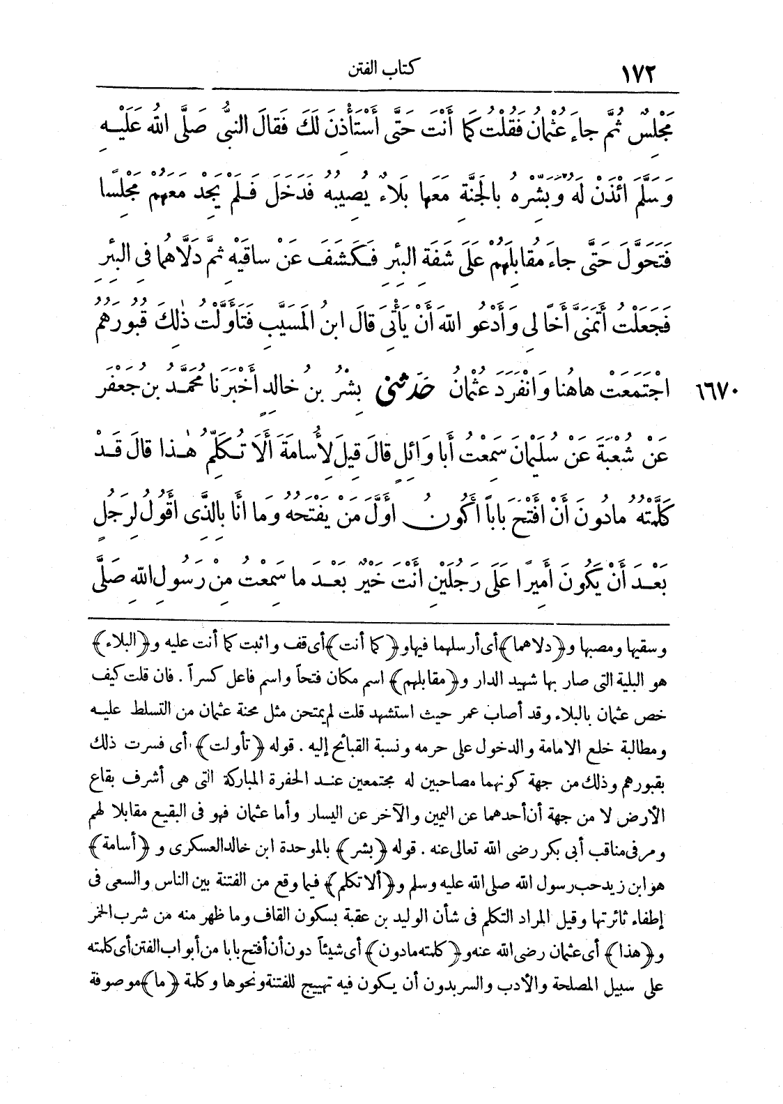 وسقيها ومصبها و (دلاهما) أي أرسلهما فيها و (كما أنت) أي قف واثبت كما أنت عليه و (البلاء) هو البلية التي صار بها شهيد الدار و (مقابلهم) اسم مكان فتحا واسم فاعل كسرا. فإن قلت كيف خص عثمان بالبلاء وقد أصاب عمر حيث استشهد قلت لم يمتحن مثل محنة عثمان من التسلط عليه ومطالبة خلع الامامة والدخول على حرمه ونسبة القبائح اليه. قوله (تأولت) أي فسرت ذلك بقبورهم وذلك من جهة كونهما مصاحبين له مجتمعين عند الحفرة المباركة التي هي أشرف بقاع الأرض لا من جهة أن أحدهما عن اليمين والآخر عن اليسار وأما عثمان فهو في البقيع مقابلا لهم ومر في مناقب أبي بكر رصي الله تعالى عنه. قوله (بشر) بالموحدة ابن خالد العسكري و (أسامة) هو ابن زيد حب رسول الله صلى الله عليه وسلم و (ألا تكلم) فيما وقع من الفتنة بين الناس والسعي في اطفاء ثائرتها وقيل المراد التكلم في شأن الوليد بن عقبة بسكون القاف وما ظهر منه من شرب الخمر و (هذا) أي عثمان رضي الله عنه و (كلمته ما دون) أي شيئا دون أن أفتح بابا من أبواب الفتن أي كلمته على سبيل المصلحة والأدب والسر بدون أن يكون فيه تهييج للفتنة ونحوها وكلمة (ما) موصوفة