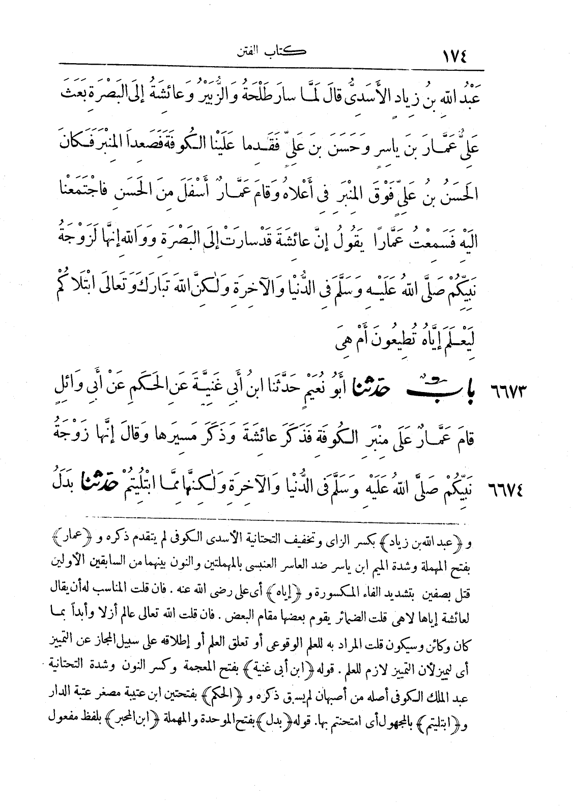 عَبْدُ اللَّهِ بْنُ زِيَادٍ الْأَسَدِيُّ قَالَ لَمَّا سَارَ طَلْحَةُ وَالزُّبَيْرُ وَعَائِشَةُ إِلَى الْبَصْرَةِ بَعَثَ عَلِيٌّ عَمَّارَ بْنَ يَاسِرٍ وَحَسَنَ بْنَ عَلِيٍّ فَقَدِمَا عَلَيْنَا الْكُوفَةَ فَصَعِدَا الْمِنْبَرَ فَكَانَ الْحَسَنُ بْنُ عَلِيٍّ فَوْقَ الْمِنْبَرِ فِي أَعْلَاهُ وَقَامَ عَمَّارٌ أَسْفَلَ مِنْ الْحَسَنِ فَاجْتَمَعْنَا إِلَيْهِ فَسَمِعْتُ عَمَّارًا يَقُولُ إِنَّ عَائِشَةَ قَدْ سَارَتْ إِلَى الْبَصْرَةِ وَوَاللَّهِ إِنَّهَا لَزَوْجَةُ نَبِيِّكُمْ صَلَّى اللَّهُ عَلَيْهِ وَسَلَّمَ فِي الدُّنْيَا وَالْآخِرَةِ وَلَكِنَّ اللَّهَ تَبَارَكَ وَتَعَالَى ابْتَلَاكُمْ لِيَعْلَمَ إِيَّاهُ تُطِيعُونَ أَمْ هِيَ