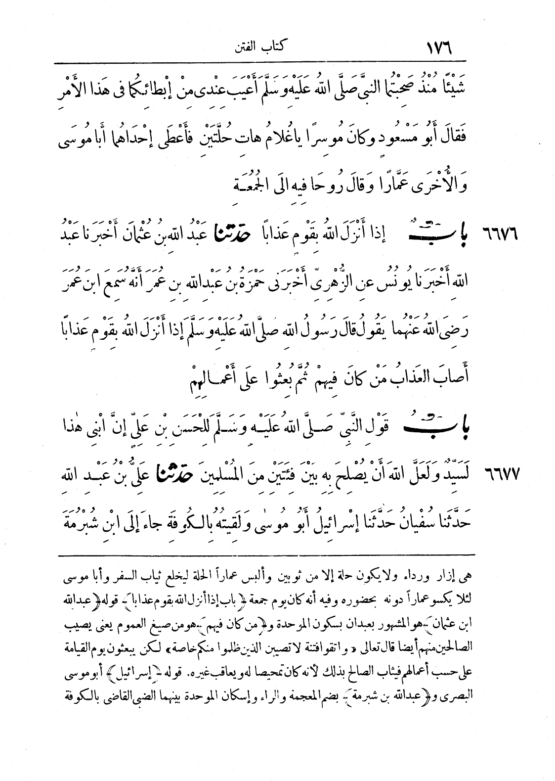 هي إزار ورداء ولا يكون حلة إلا من ثوبين والبس عمارا الحلة ليخلع ثياب السفر وأبا موسى لئلا يكسو عمارا دونه بحضوره وفيه انه كان يوم جمعة (باب إذا انزل الله بقوم عذابا) قوله (عبد الله ابن عثمان) هو المشهور بعبدان بسكون الموحدة و (من كان فيهم) هو من صيغ العموم يعني يصيب الصالحين منهم أيضا قال تعالى «واتقوا فتنة لا تصيبين الذين ظلموا منكم خاصة» لكن يبعثون يوم القيامة على حسب أعمالهم فيثاب الصالح بذلك لأنه كان تمحيصا له ويعاقب غيره, قوله (إسرائيل) أبو موسى البصري و (عبد الله بن شبرمة) بضم المعجمة والراء وإسكان الموحدة بينهما الضبي القاضي بالكوفة
