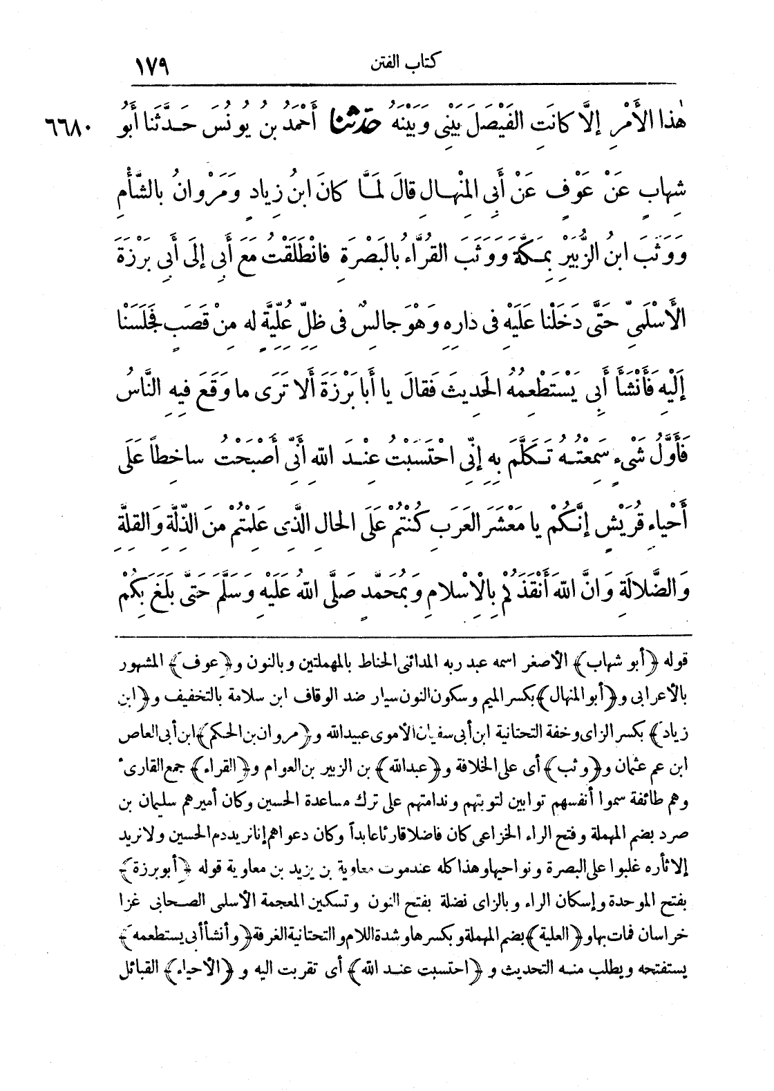 6680 - حَدَّثَنَا أَحْمَدُ بْنُ يُونُسَ حَدَّثَنَا أَبُو شِهَابٍ عَنْ عَوْفٍ عَنْ أَبِي الْمِنْهَالِ قَالَ لَمَّا كَانَ ابْنُ زِيَادٍ وَمَرْوَانُ بِالشَّامِ وَوَثَبَ ابْنُ الزُّبَيْرِ بِمَكَّةَ وَوَثَبَ الْقُرَّاءُ بِالْبَصْرَةِ فَانْطَلَقْتُ مَعَ أَبِي إِلَى أَبِي بَرْزَةَ الْأَسْلَمِيِّ حَتَّى دَخَلْنَا عَلَيْهِ فِي دَارِهِ وَهُوَ جَالِسٌ فِي ظِلِّ عُلِّيَّةٍ لَهُ مِنْ قَصَبٍ فَجَلَسْنَا إِلَيْهِ فَأَنْشَأَ أَبِي يَسْتَطْعِمُهُ الْحَدِيثَ فَقَالَ يَا أَبَا بَرْزَةَ أَلَا تَرَى مَا وَقَعَ فِيهِ النَّاسُ فَأَوَّلُ شَيْءٍ سَمِعْتُهُ تَكَلَّمَ بِهِ إِنِّي احْتَسَبْتُ عِنْدَ اللَّهِ أَنِّي أَصْبَحْتُ سَاخِطًا عَلَى أَحْيَاءِ قُرَيْشٍ إِنَّكُمْ يَا مَعْشَرَ الْعَرَبِ كُنْتُمْ عَلَى الْحَالِ الَّذِي عَلِمْتُمْ مِنْ الذِّلَّةِ وَالْقِلَّةِ وَالضَّلَالَةِ وَإِنَّ اللَّهَ أَنْقَذَكُمْ بِالْإِسْلَامِ وَبِمُحَمَّدٍ صَلَّى اللَّهُ عَلَيْهِ وَسَلَّمَ حَتَّى بَلَغَ بِكُمْ