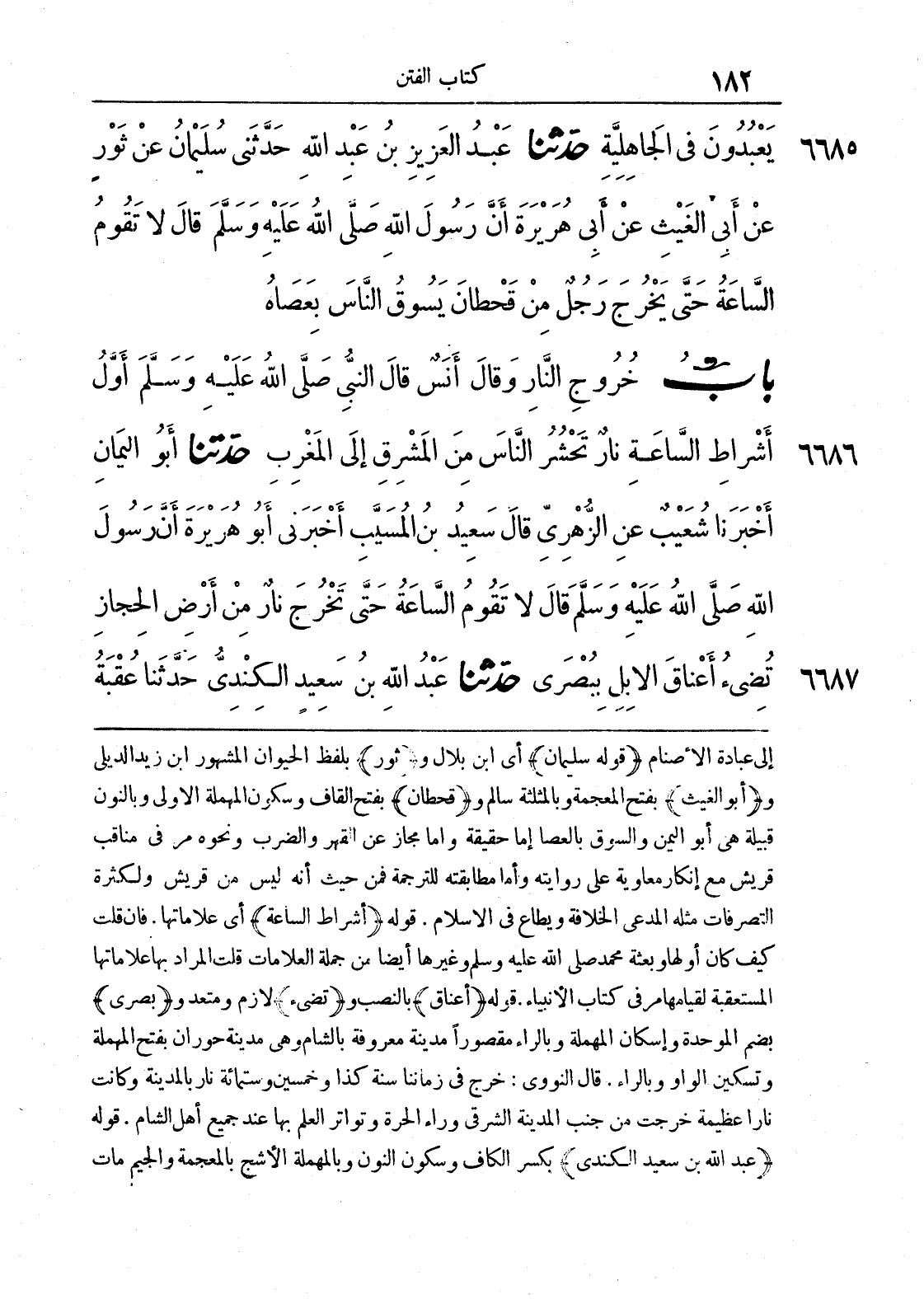 6686 - حَدَّثَنَا أَبُو الْيَمَانِ أَخْبَرَنَا شُعَيْبٌ عَنْ الزُّهْرِيِّ قَالَ سَعِيدُ بْنُ الْمُسَيَّبِ أَخْبَرَنِي أَبُو هُرَيْرَةَ أَنَّ رَسُولَ اللَّهِ صَلَّى اللَّهُ عَلَيْهِ وَسَلَّمَ قَالَ لَا تَقُومُ السَّاعَةُ حَتَّى تَخْرُجَ نَارٌ مِنْ أَرْضِ الْحِجَازِ تُضِيءُ أَعْنَاقَ الْإِبِلِ بِبُصْرَى